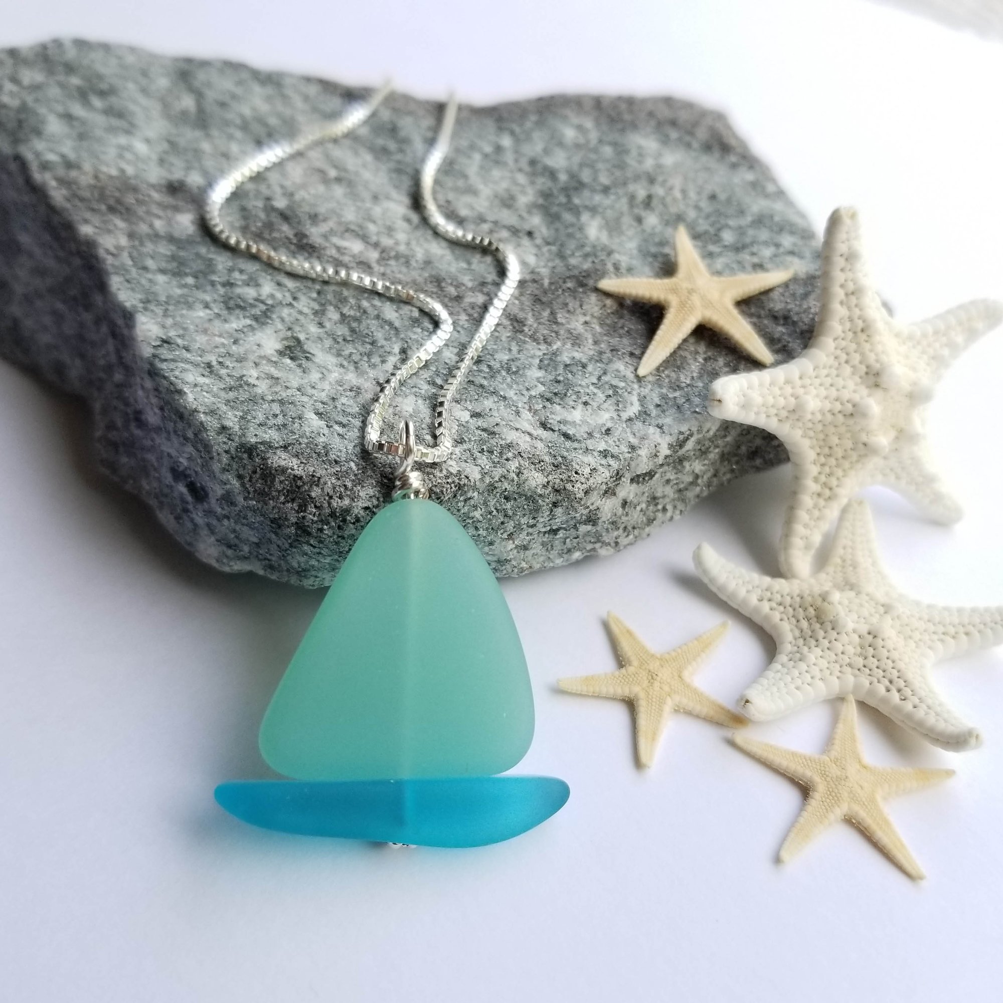Ahoy there. This pretty cultured sea glass necklace is a fun and colorful accessory for boaters, sailors, and coastal beach lovers. Celebrate summer. Seafoam green and bay blue-colored glass.