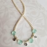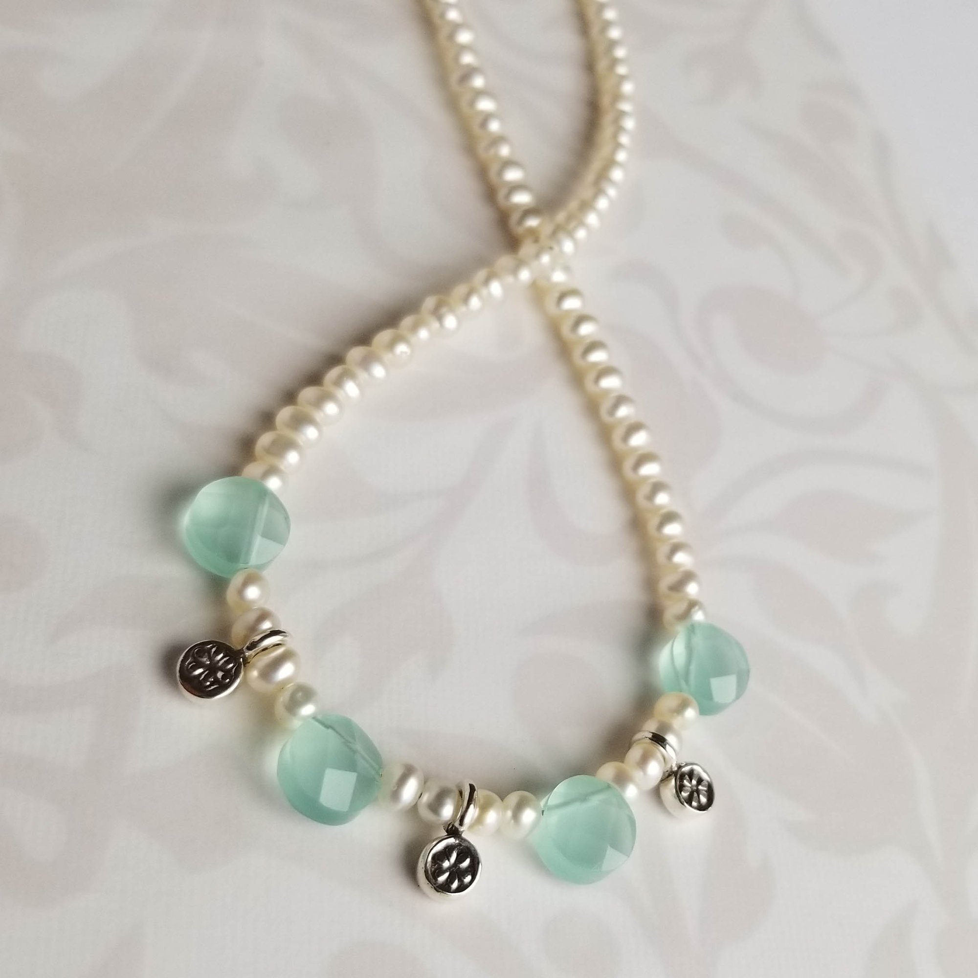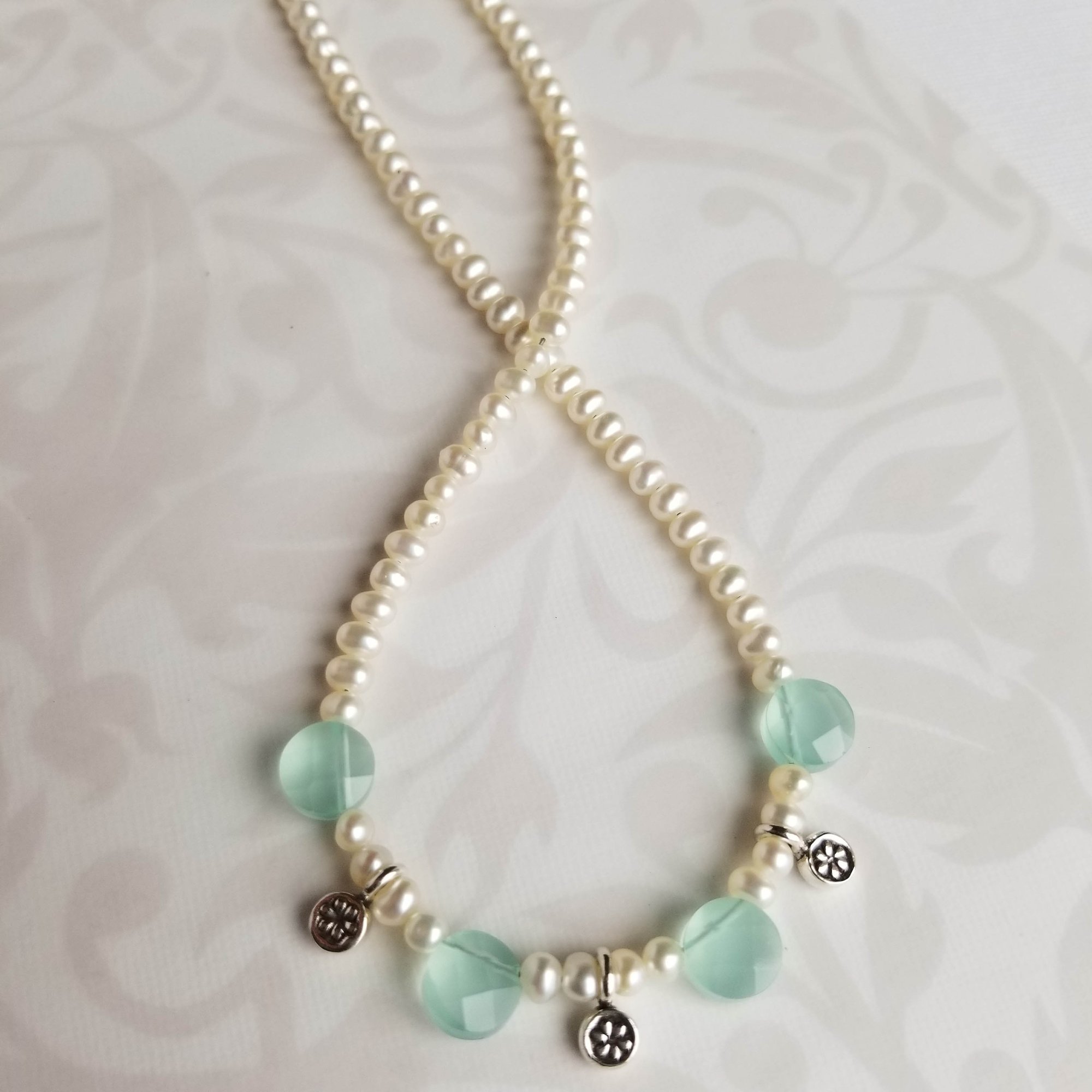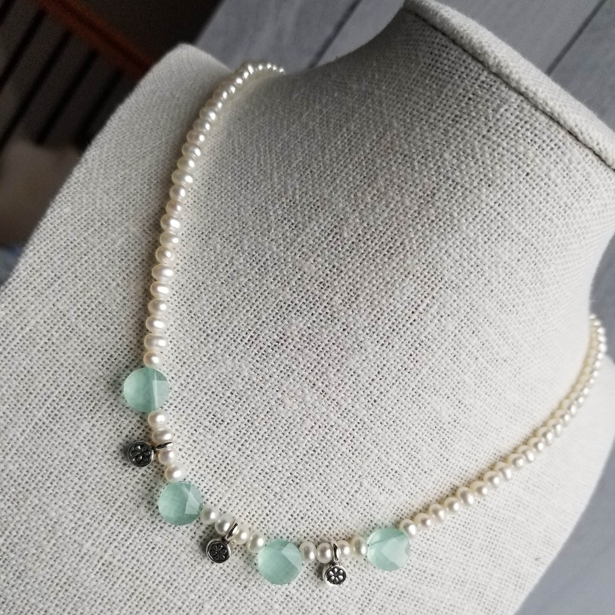 A lovely summer necklace. A strand of small white freshwater pearls (4mm), four faceted aqua chalcedony coin beads and tiny Hilltribe sterling silver floral charms. Length is adjustable from 15-1/2” – 17-1/2”. Lovely lovely lovely.