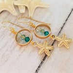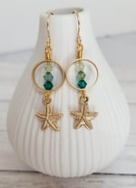 Bumpy gold (brass) starfish dangle beneath a colorful trio of Swarovski crystals. Classic summertime earrings. Gold-filled earwires.