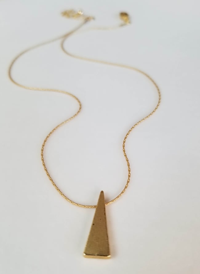 A simple sophisticated necklace. The matte gold electroplated brass triangle pendant slides along a slim matte gold electroplated brass chain. Brass is a clean metal that is non-reactive when worn on the skin as it is naturally nickel, lead, and cadmium-free .