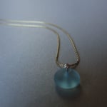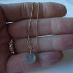 A simple pale aqua (cultured) sea glass disc hangs from a super slim sterling or electroplated matte gold chain. Each disc has a unique shape.