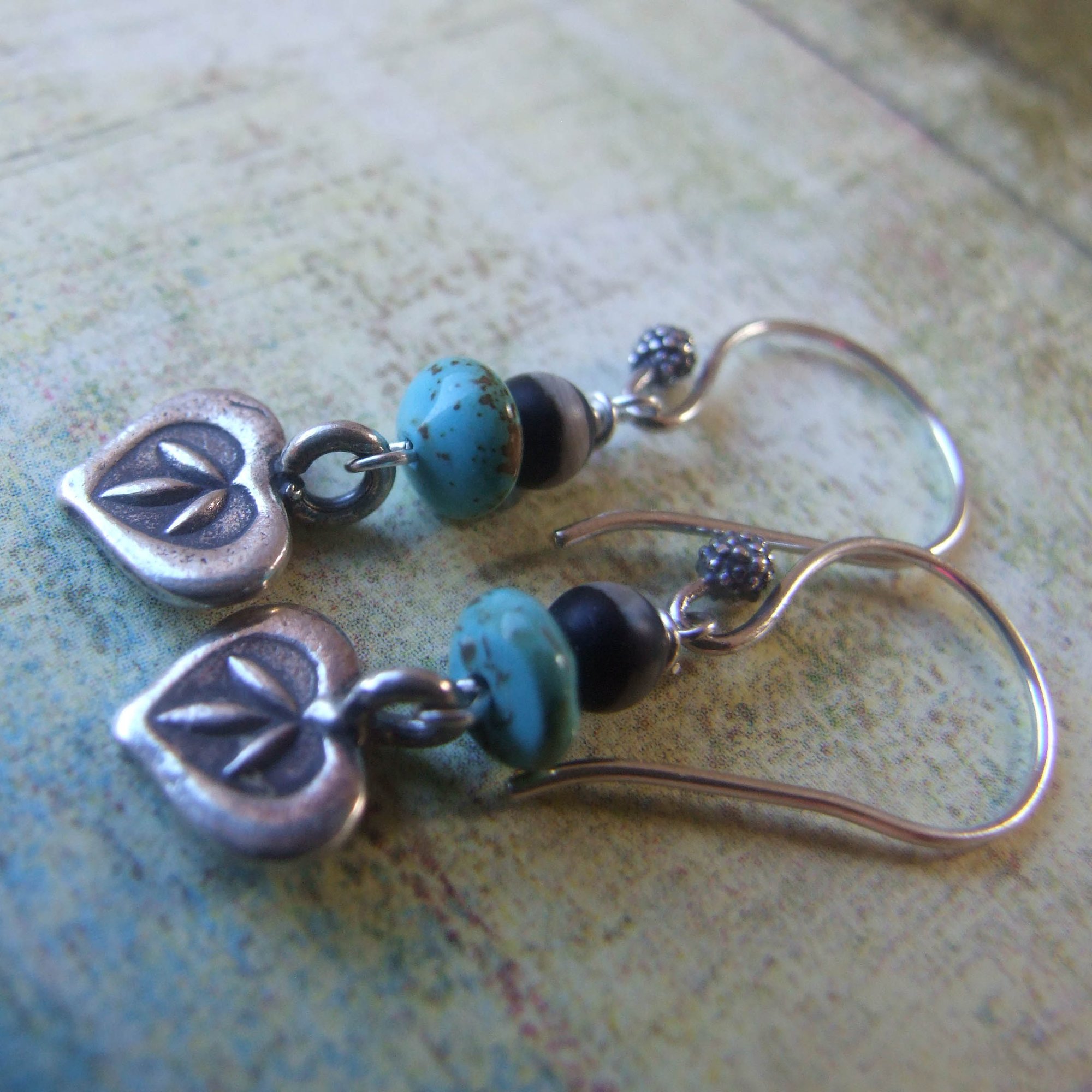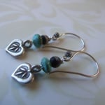 Hilltribe sterling silver leaves sway beneath turquoise rondelles and earthy black tribal beads. These are delicate earrings. Great go-to for everyday wear. Sterling ear wires.