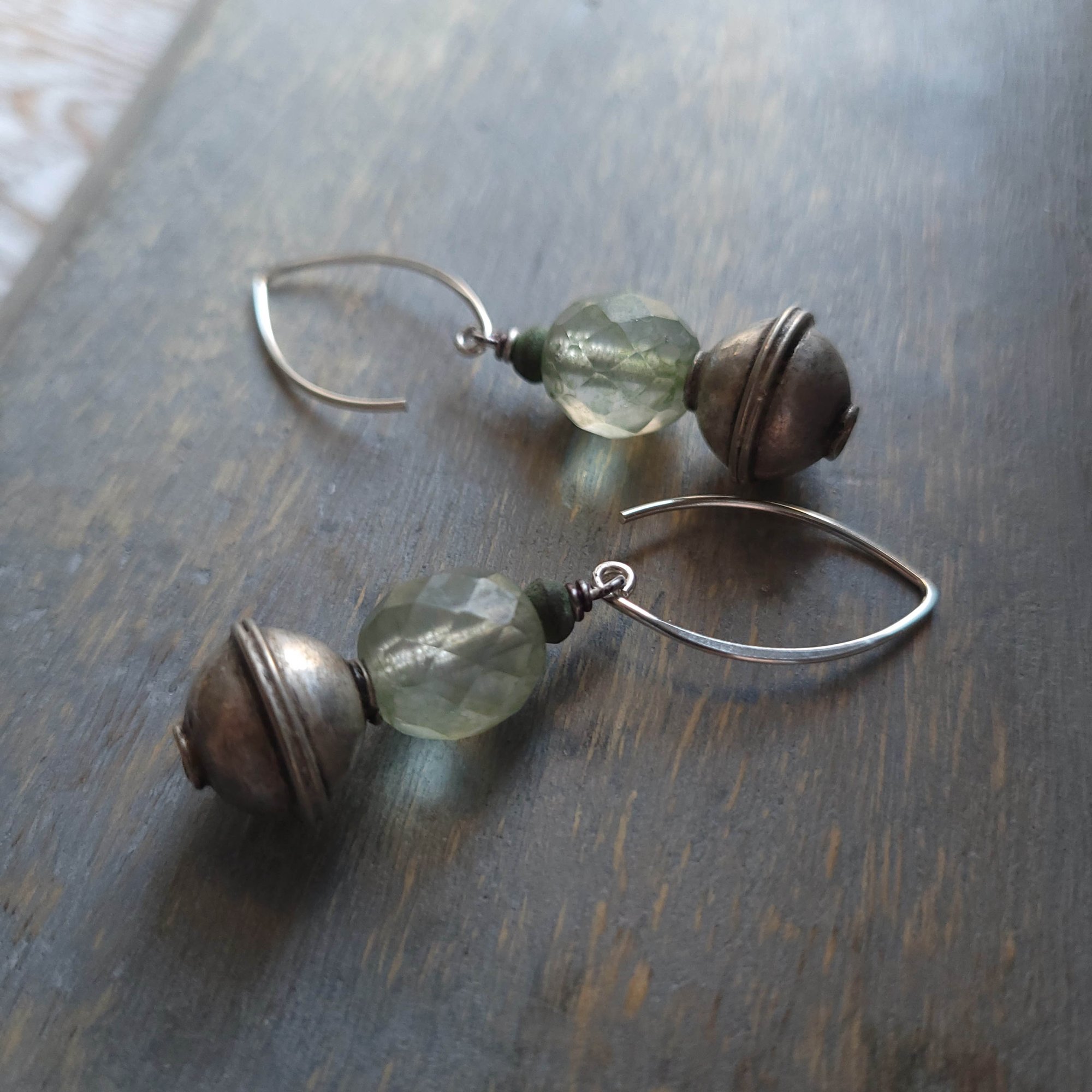 Soft. Rustic. Earthy. Faceted matte green crystals, tiny green wood rondelles, and aged patina antique silver Ethiopian beads form these lovely earrings. Hanging from almond shaped sterling silver ear wires.