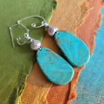 Beautiful smooth slabs of turquoise are topped by plump Hilltribe sterling silver rondelles and tiny daisy stamped beads. Hanging from hand-forged almond shaped sterling silver ear wires. Big beautiful beads provide lovely motion. Length is 2-1/2” from the top of the ear wire to the bottom of the turquoise beads.