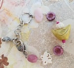 A sweet collection of all things spring: oval pink opal, pink czech glass flowers, handmade clay bird topped with a carved bone flower, carved bond butterfly, pink agate barrel. Metal components are silverplated brass (naturally lead and nickel free). Length is a flexible 6.5" - 8".