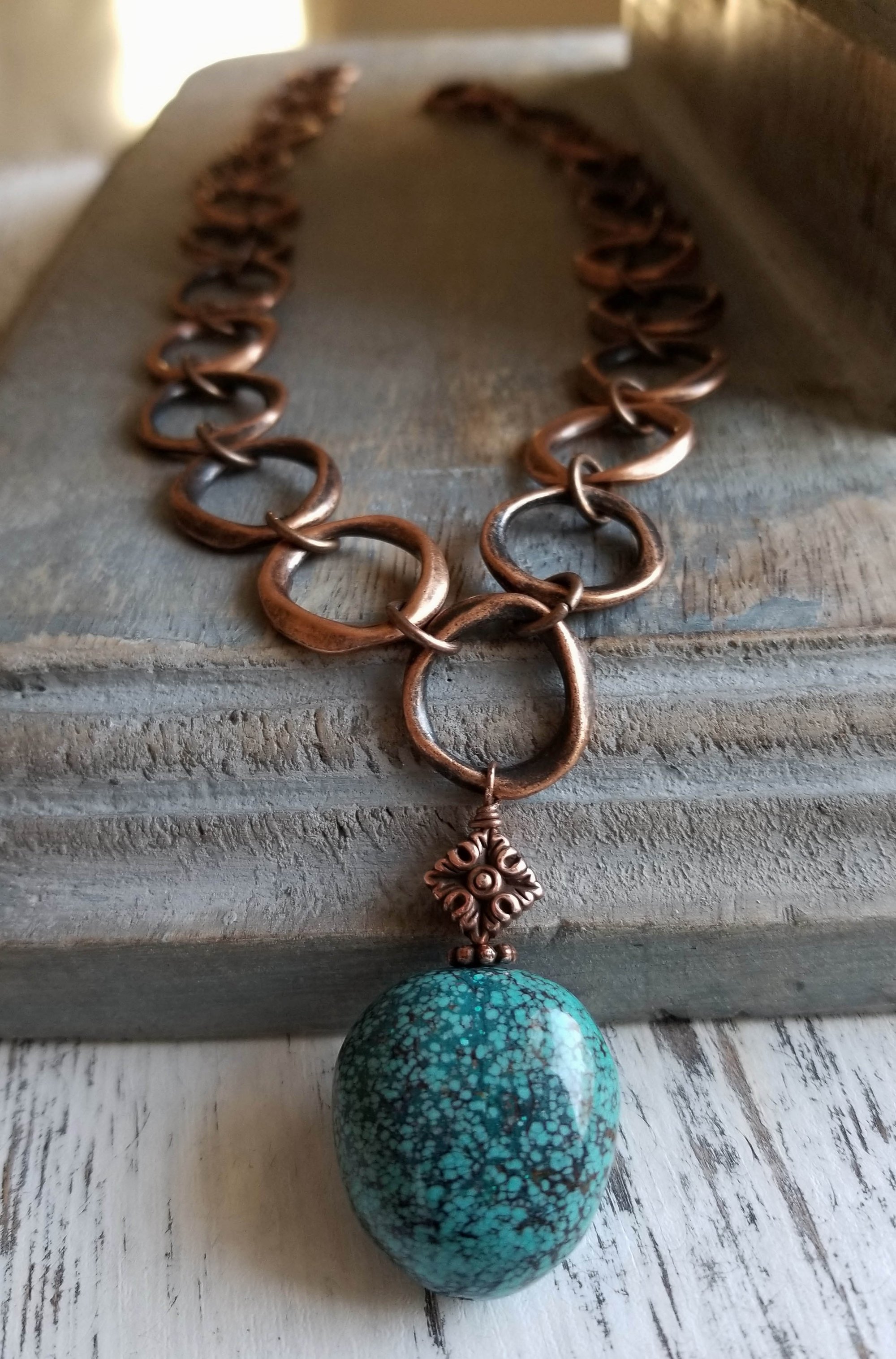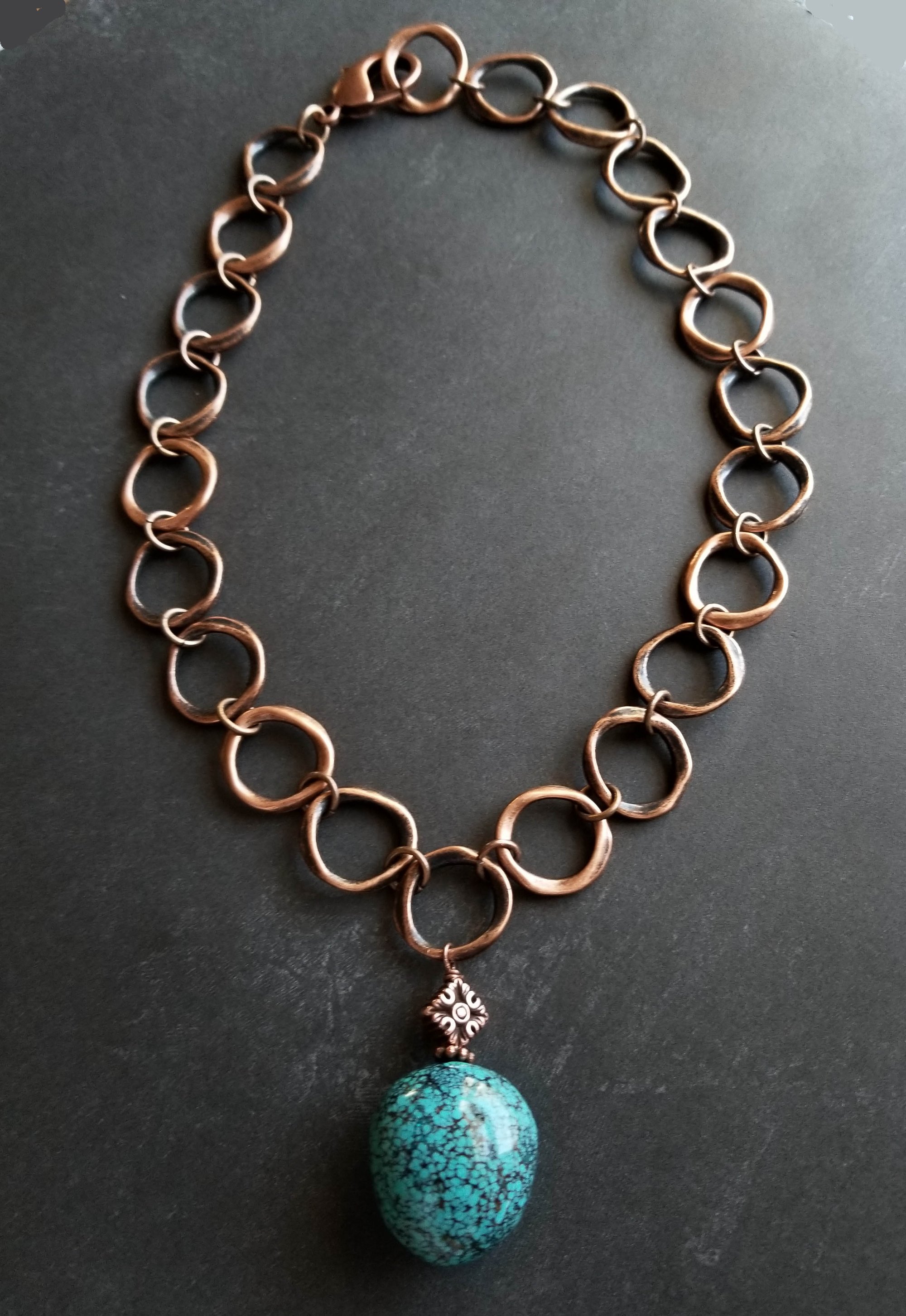 Subtly southwestern. A large web-speckled turquoise bead is topped by a copper diamond-shaped bead cast with a pretty leaf motif. Hanging from an antique copper chain of large organic-shaped links. Pendant measures 1-¾”. Necklace length is up to 18”. Finished with a large (1”) antique copper lobster clasp.