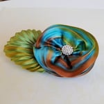 OMG gorgeous. A big hand sewn (by me!) floral brooch. Beautiful hand-dyed silk in variegated soft earthy tones of blue, yellow, green, brown; hand-dyed green silk leaf. The center is accented with a stunning re-purposed vintage rhinestone earring. Super lovely and very special. Back is beautifully finished with wool felt.