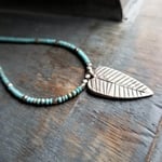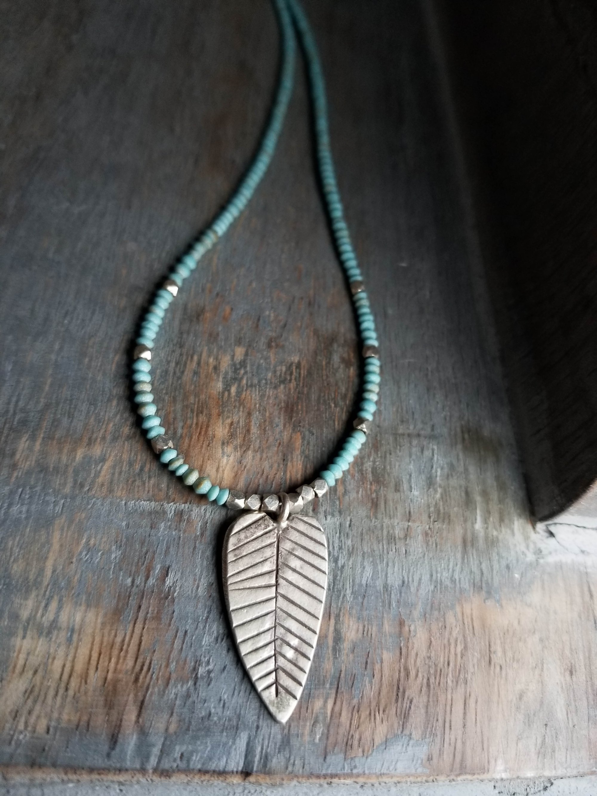A handmade Thai sterling silver leaf is the sweet focal for this simple, slightly bohemian necklace. Hanging from a strand of tiny (2mm) hand cut matte turquoise beads and tiny sterling silver accents. Finished with a silver lobster clasp.