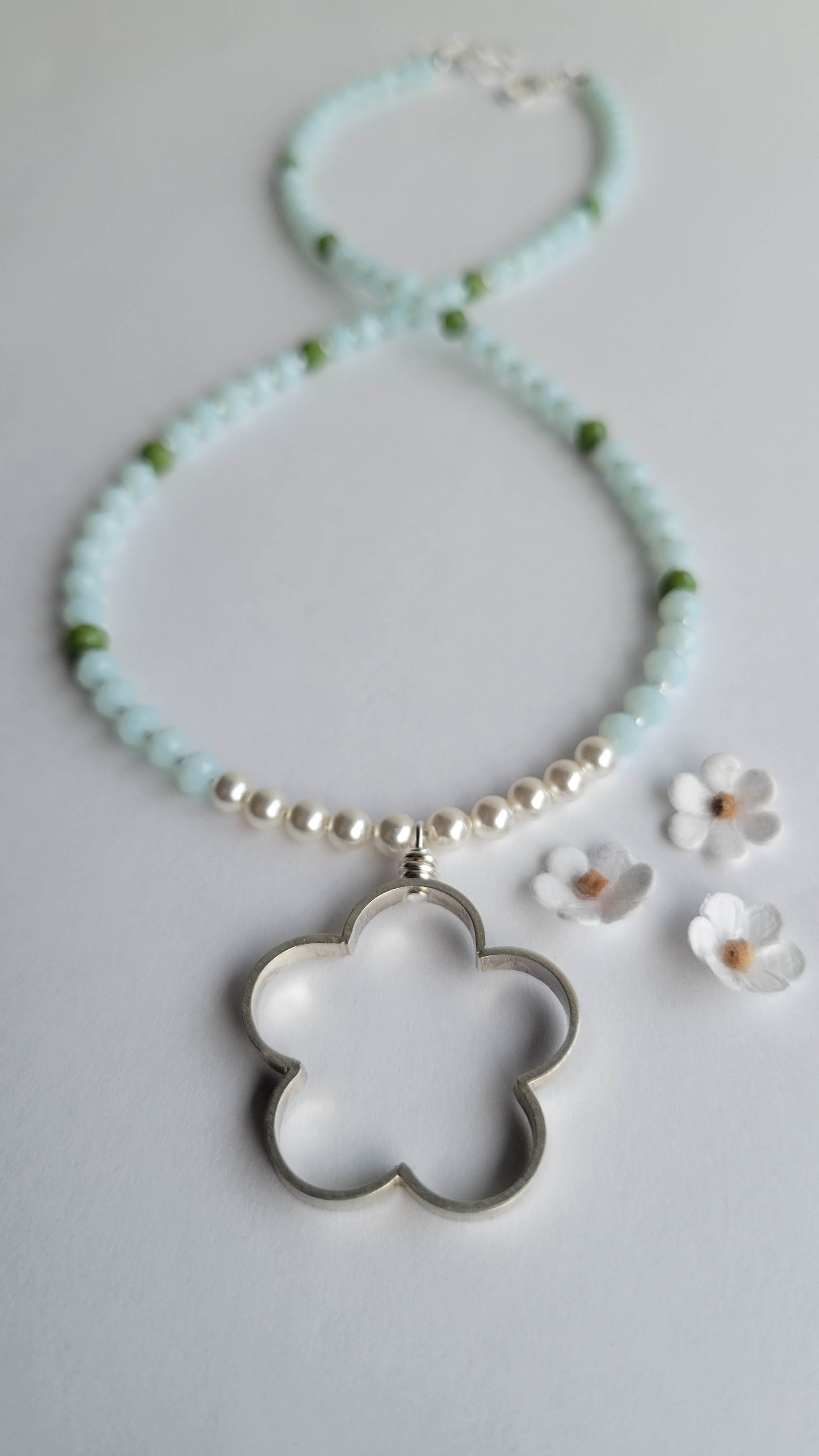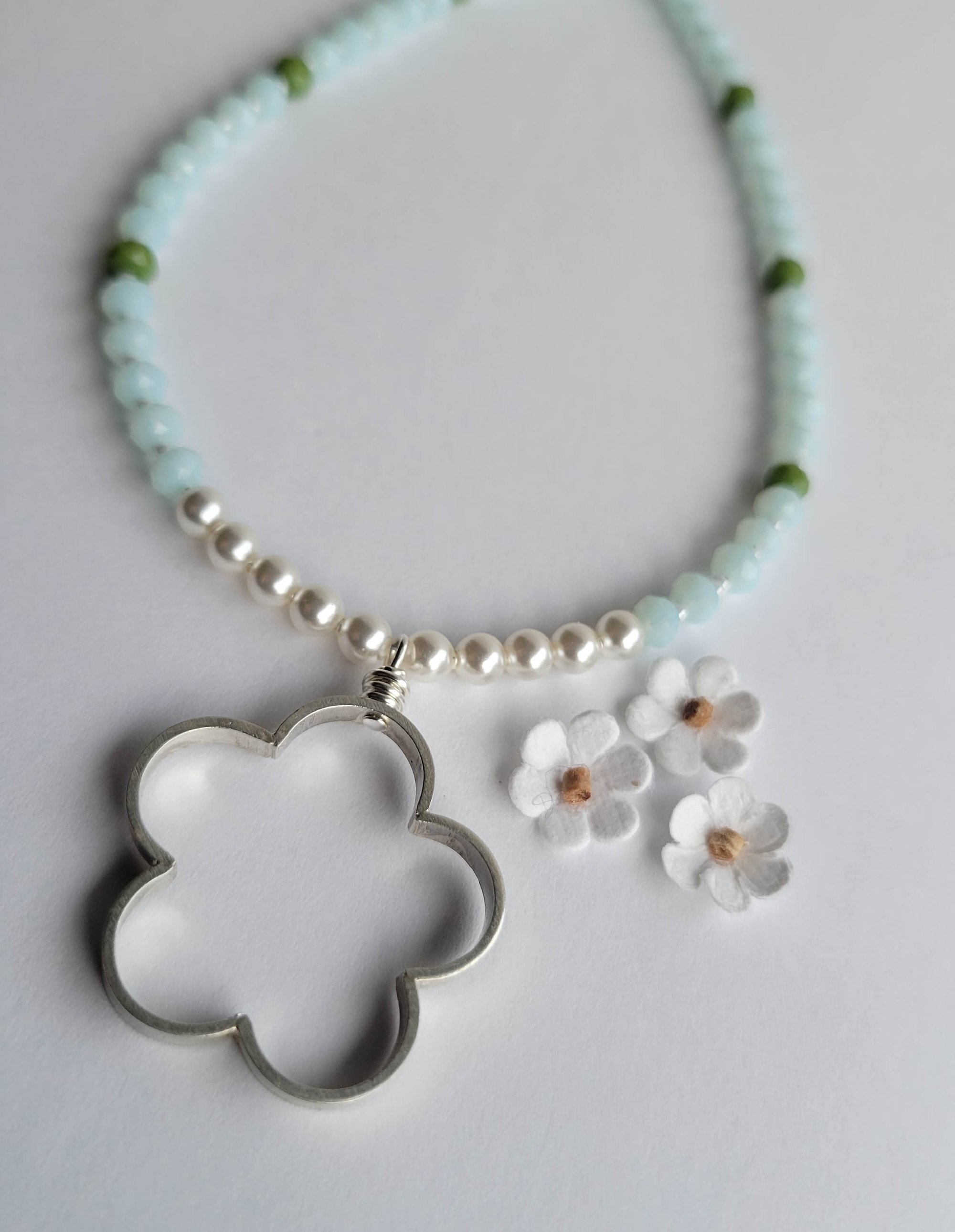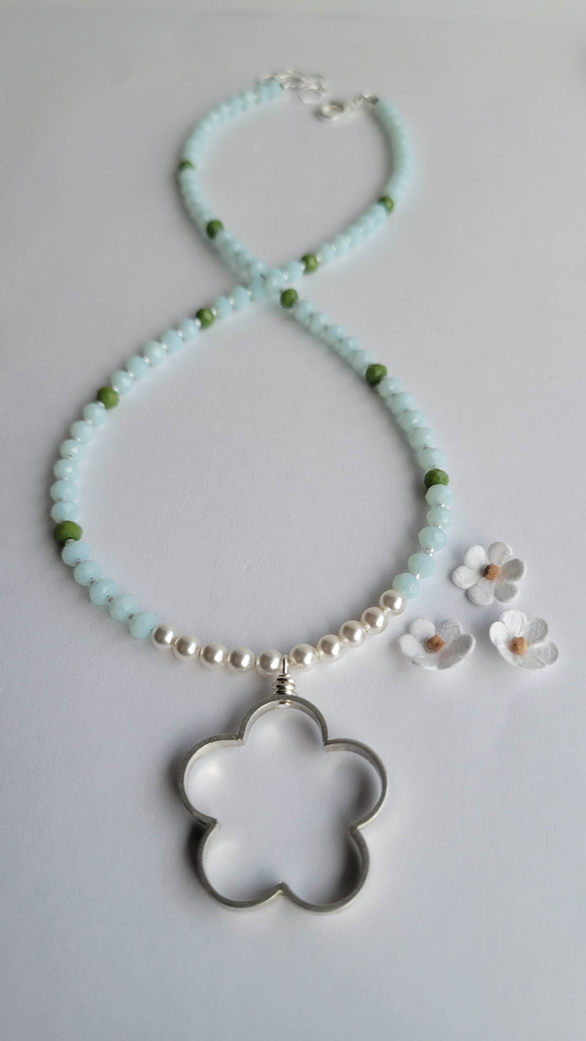 A sweet and whimsical necklace: Sterling silver open flower pendant hangs beneath a short row of white Swarovski pearls and pale blue and leaf green crystal rondelles, each separated by tiny white pearl seed beads. Fun. Fun. Fun… and, a bit of boheme.