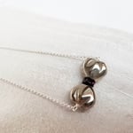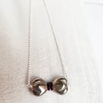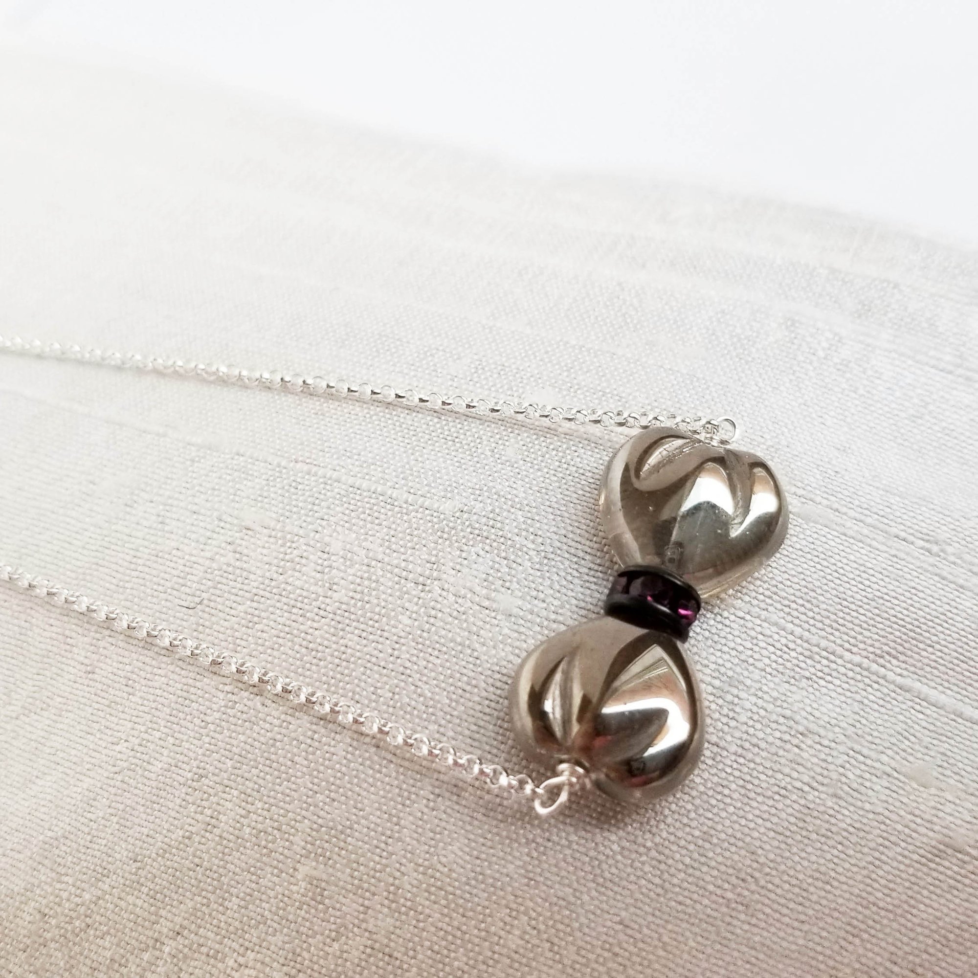 A tiny pewter-colored glass bow, front and center, makes a lovely pendant for this sweet girly necklace. The perfect accessory for your next social occasion. Accented in the center with pinkish purple rhinestones. Hanging from a silver rolo chain. Pendant measures nearly 1".