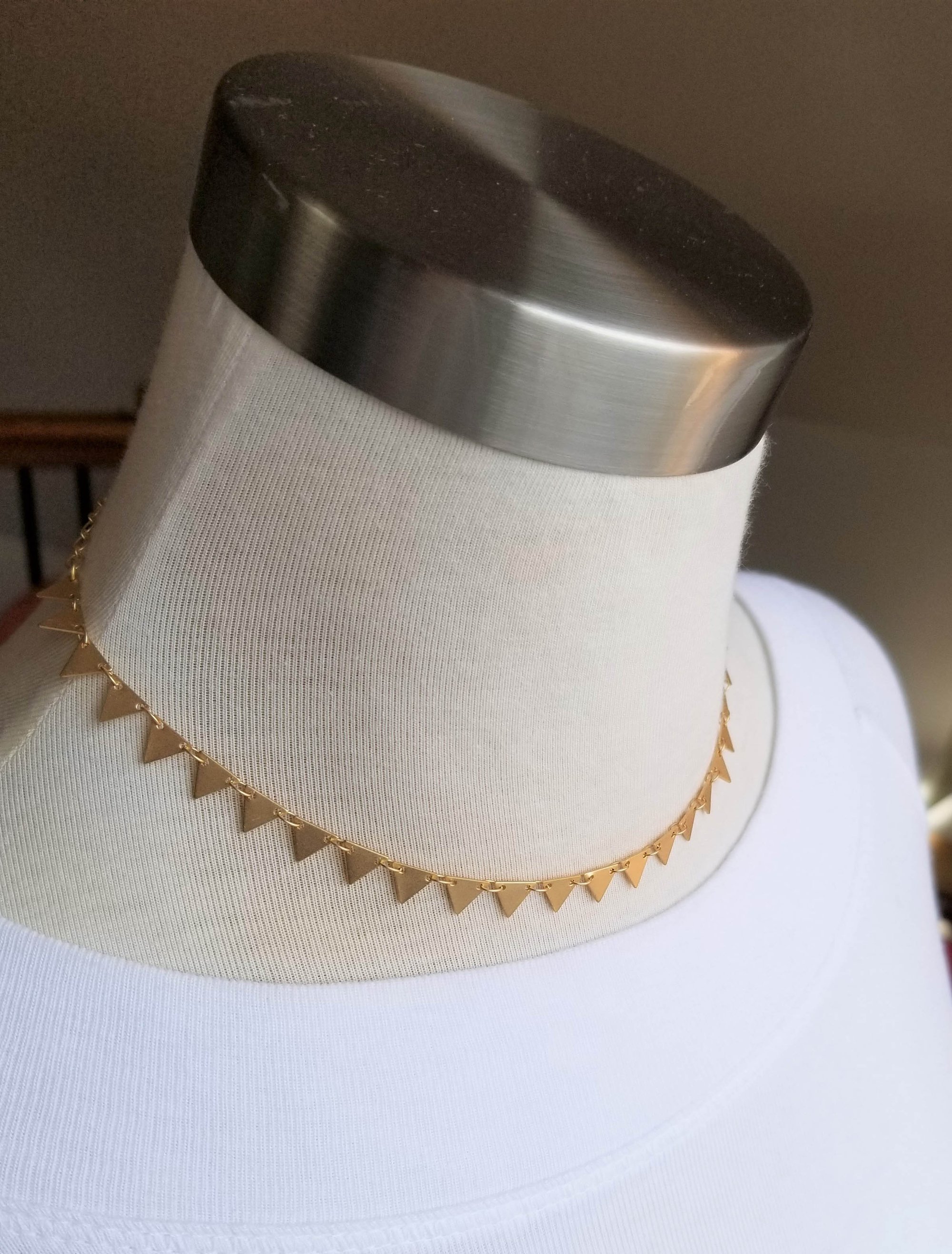 Tiny matte gold triangles. Finished with a simple matte gold oval diamond chain and a matte gold lobster clasp. (All components are electroplated, providing a very durable finish).