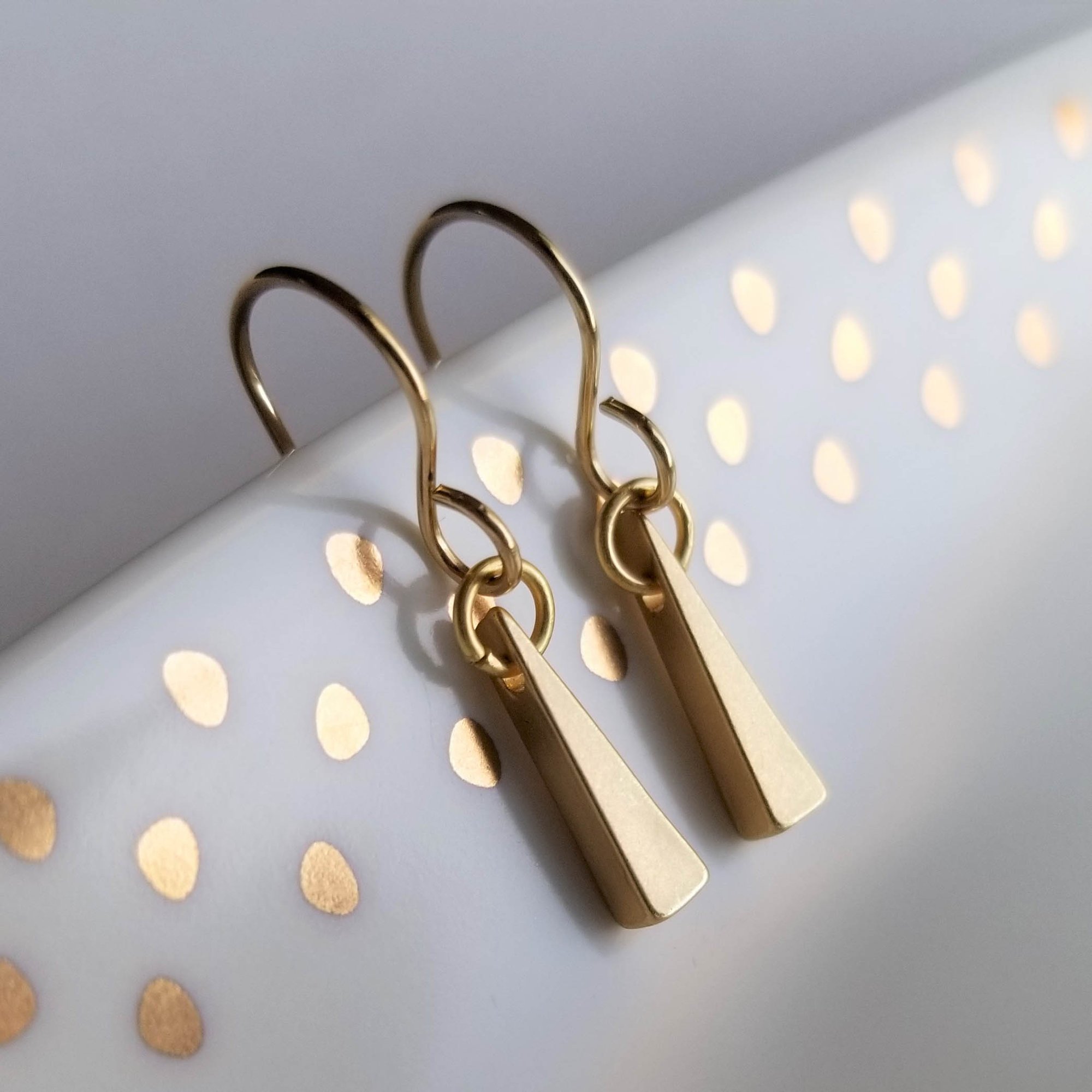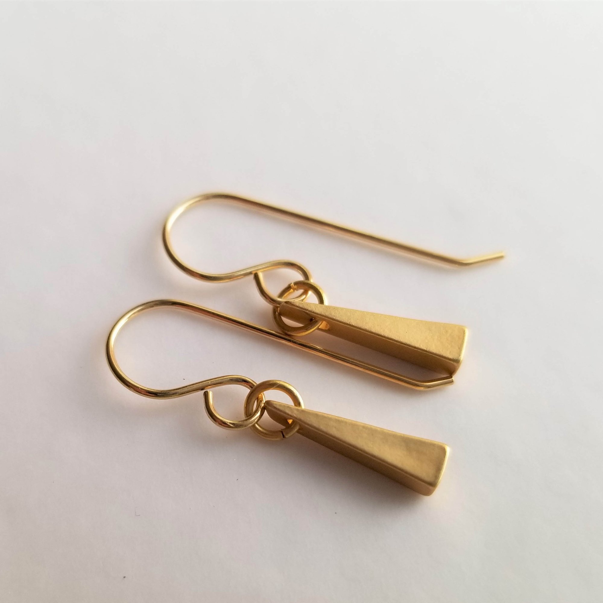 Tiny matte gold triangles hang from gold filled ear wires. Simple. Geometric. Love.