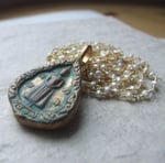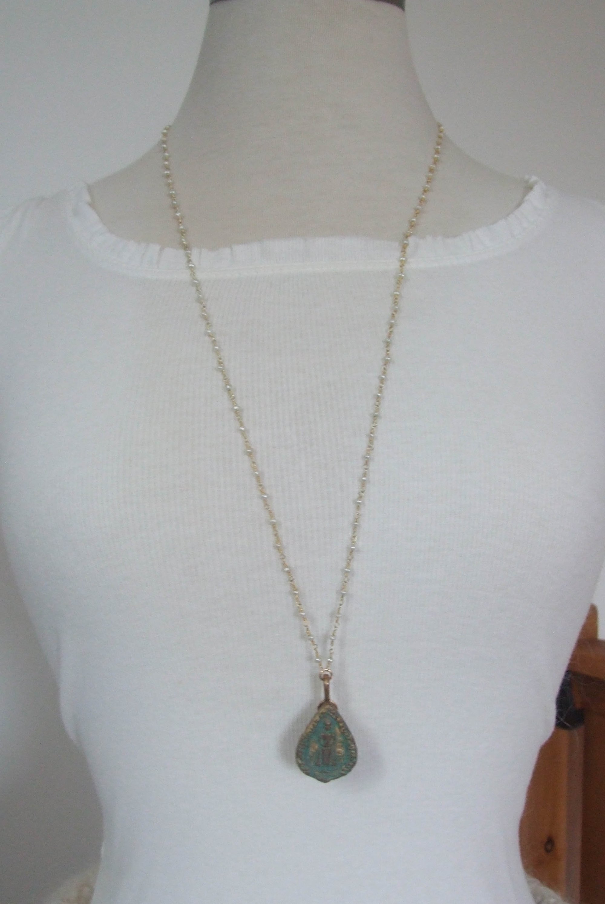 A teal patina tranquil Buddha (hand-colored clay pendant) is the pretty focal of this sweet necklace; hanging from a tiny freshwater pearl chain. Tranquil bohemian.