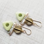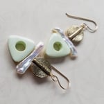 Classic tribal styling. Made from spiral brass discs, biwa freshwater stick pearls, and carved pale green chrysoprase trinagles. Hanging from gold-filled ear wires.