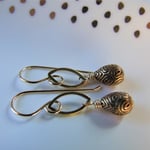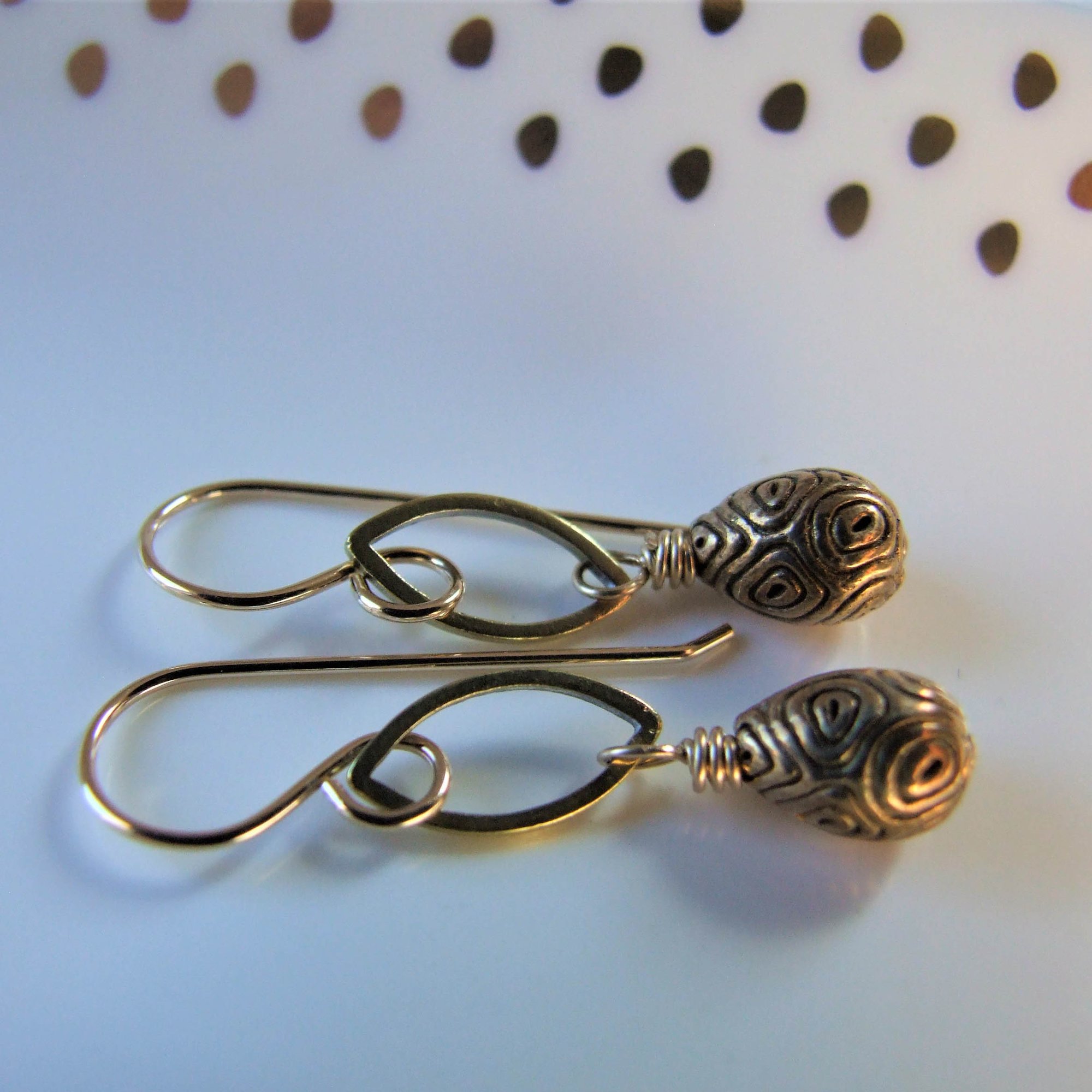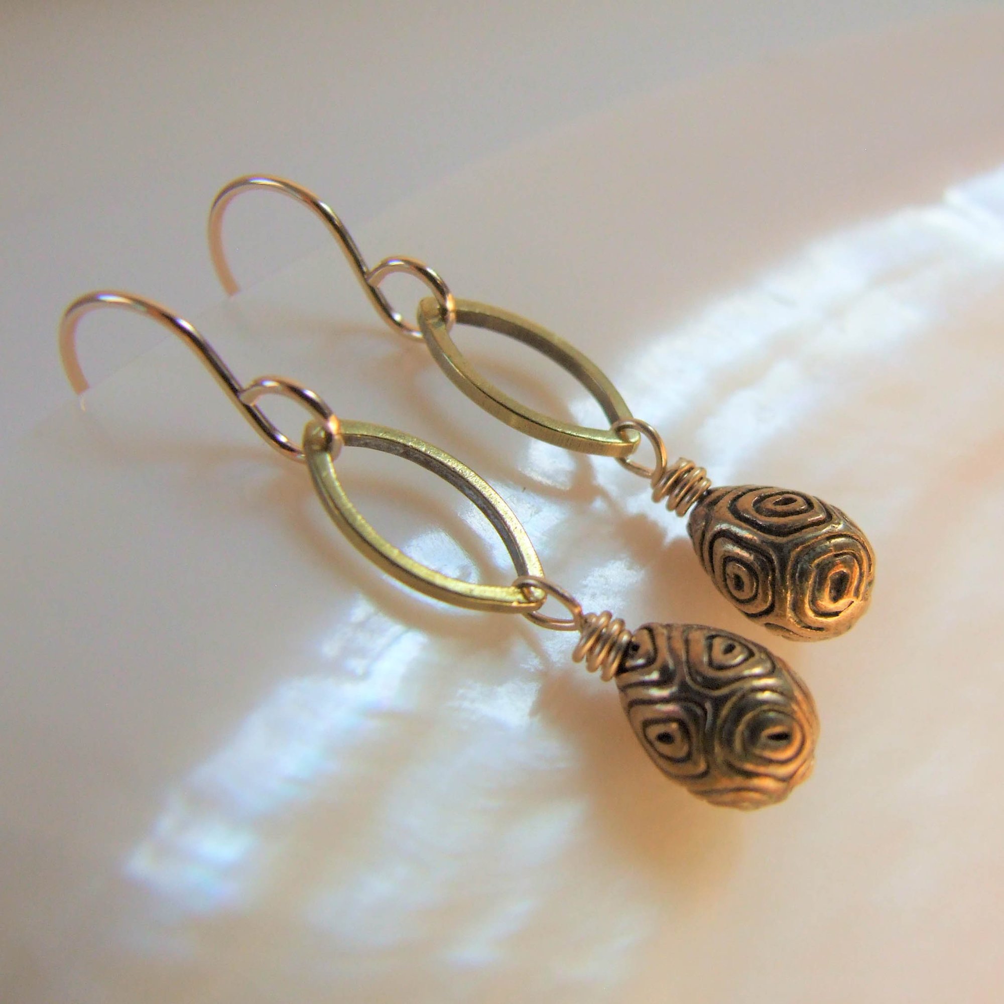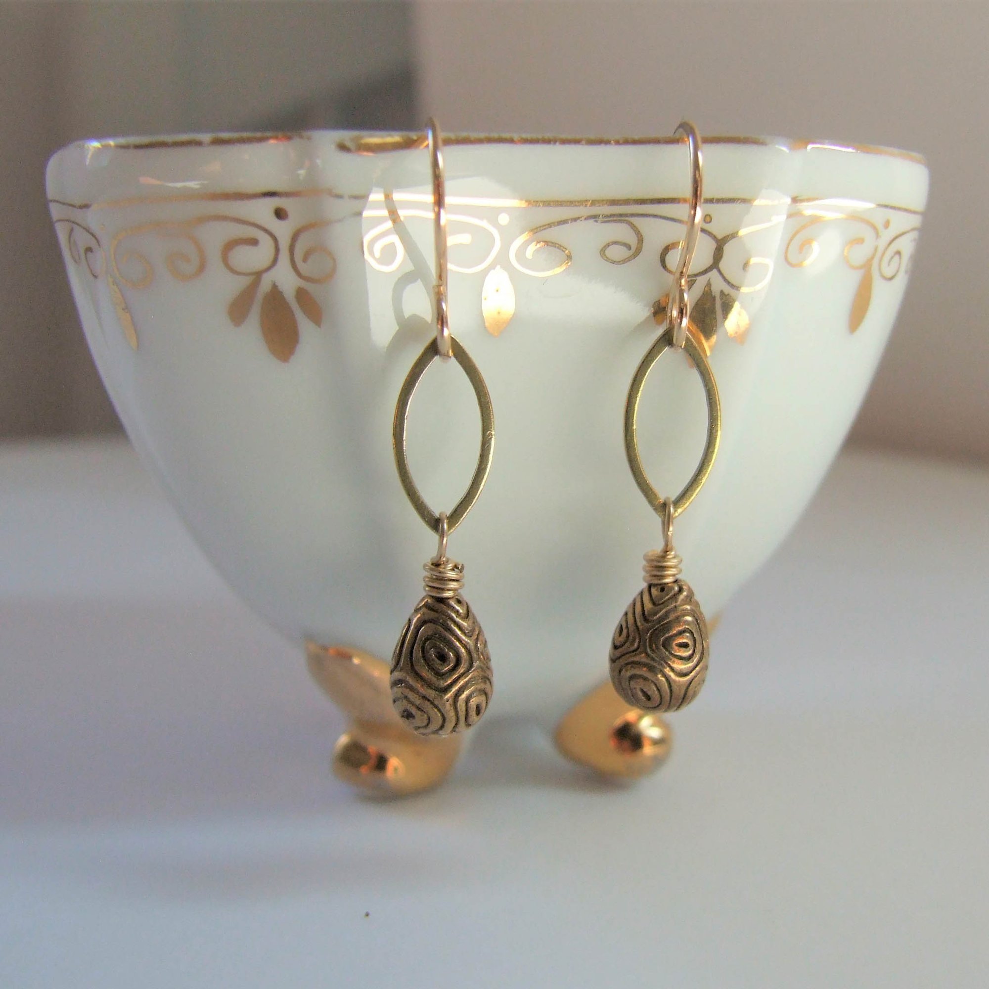 Brass teardrops with tribal markings dangle from petite brass marquis connectors. All hanging from gold filled ear wires.