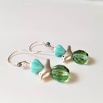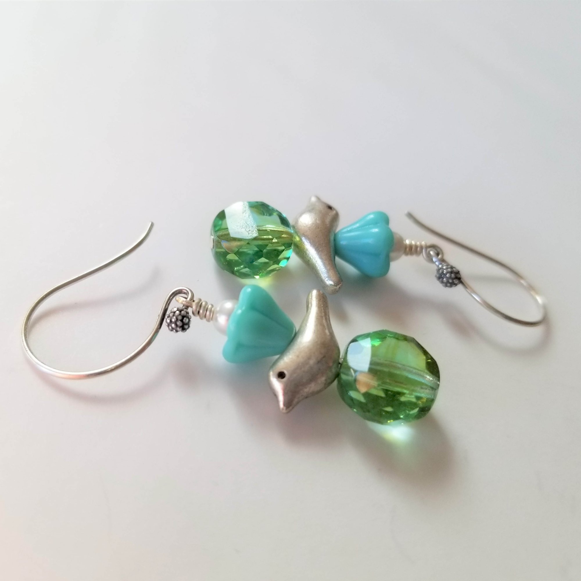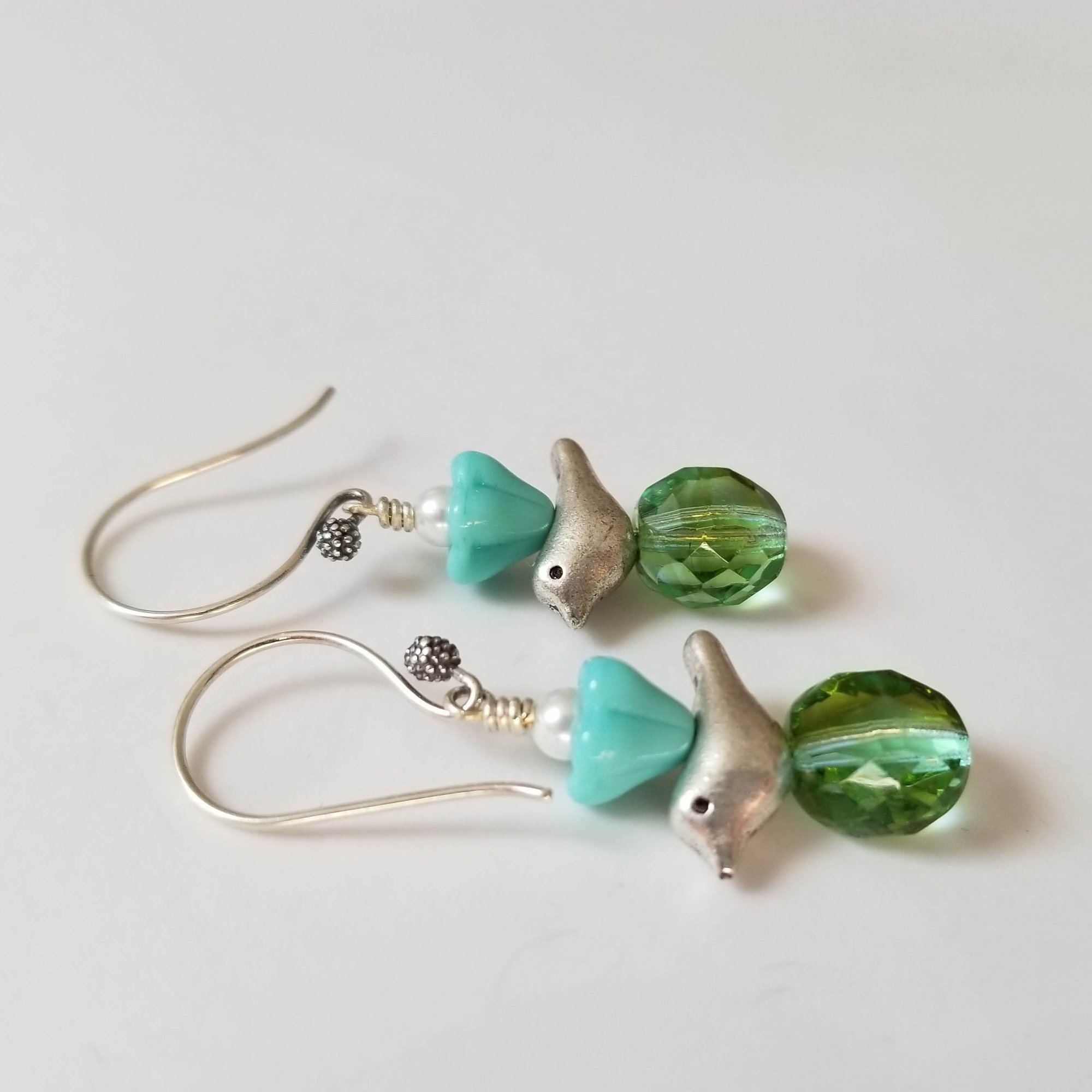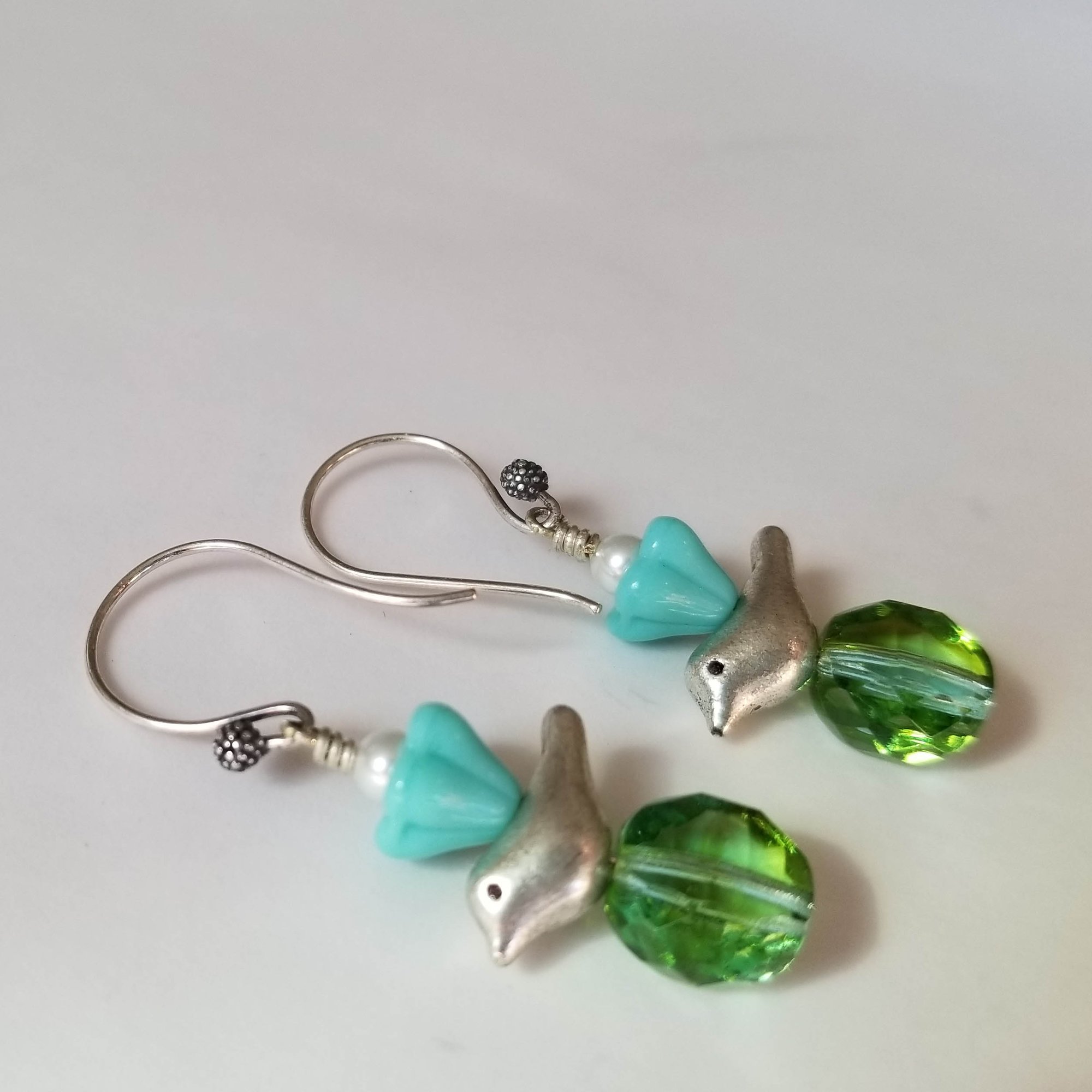 Sweet, sweet, sweet. Silver birds embellished with turquoise czech glass flowers and glass beads, and white Swarovski pearls. All hanging from handmade sterling silver ear wires.