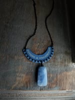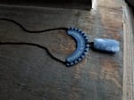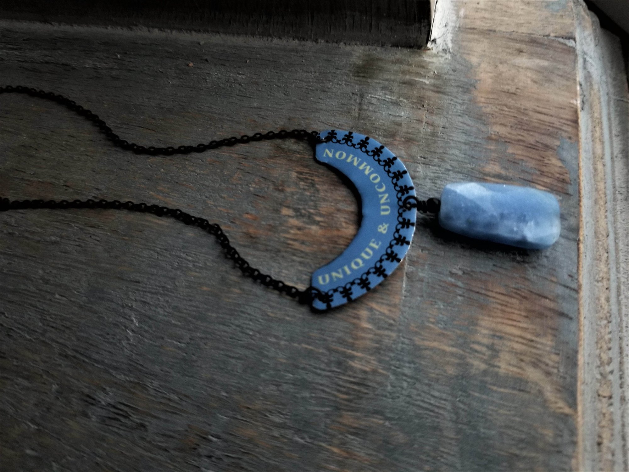 A truly unique necklace for a unique and uncommon person. This pendant is hand-cut from a tea tin and embellished with a pretty blue chalcedony rectangle. Hanging from a fine-gauge blackened rolo chain. Necklace length is adjustable from 16" - 18". Finished with a blackened lobster clasp.
