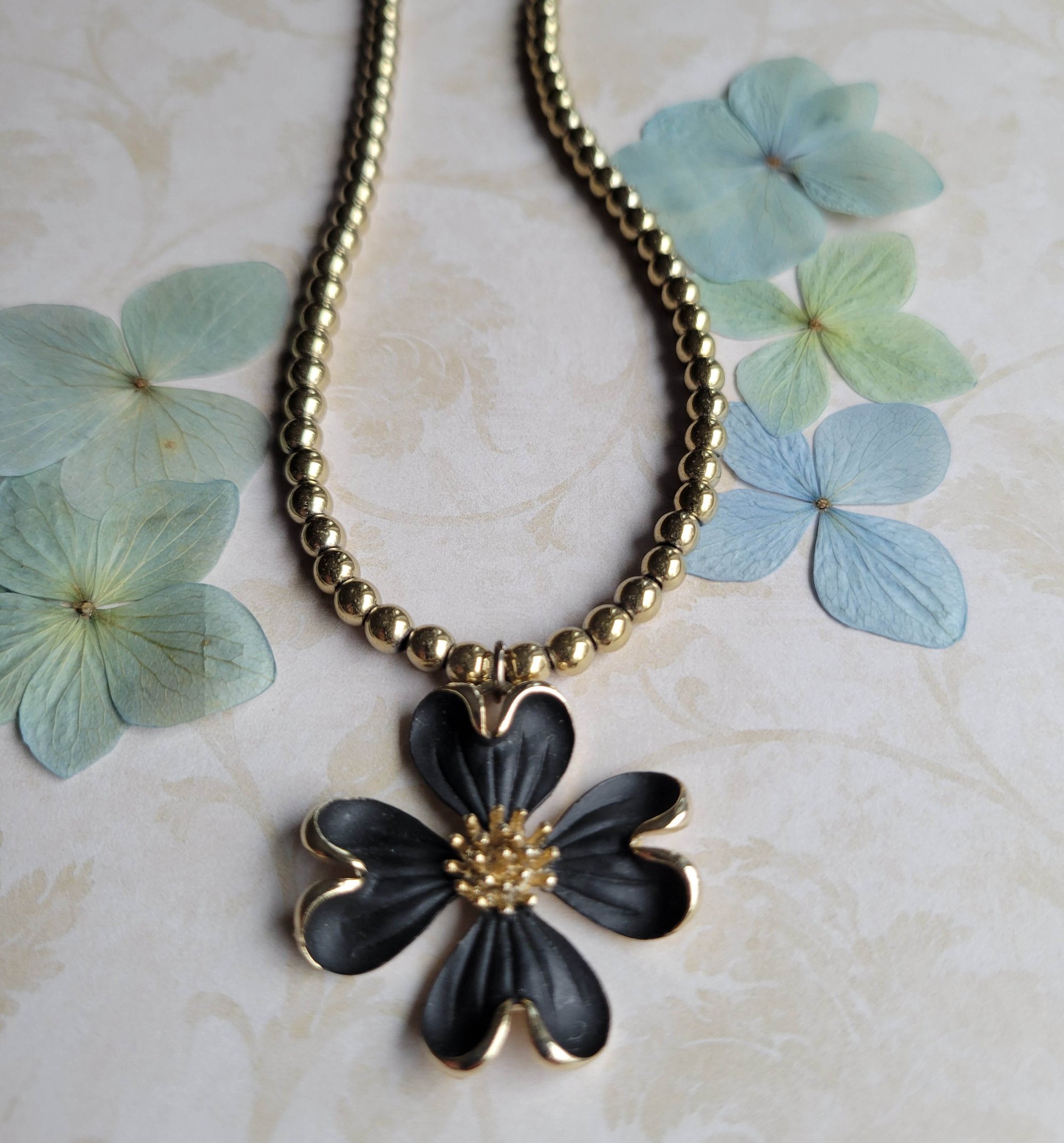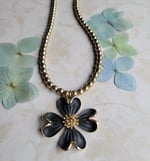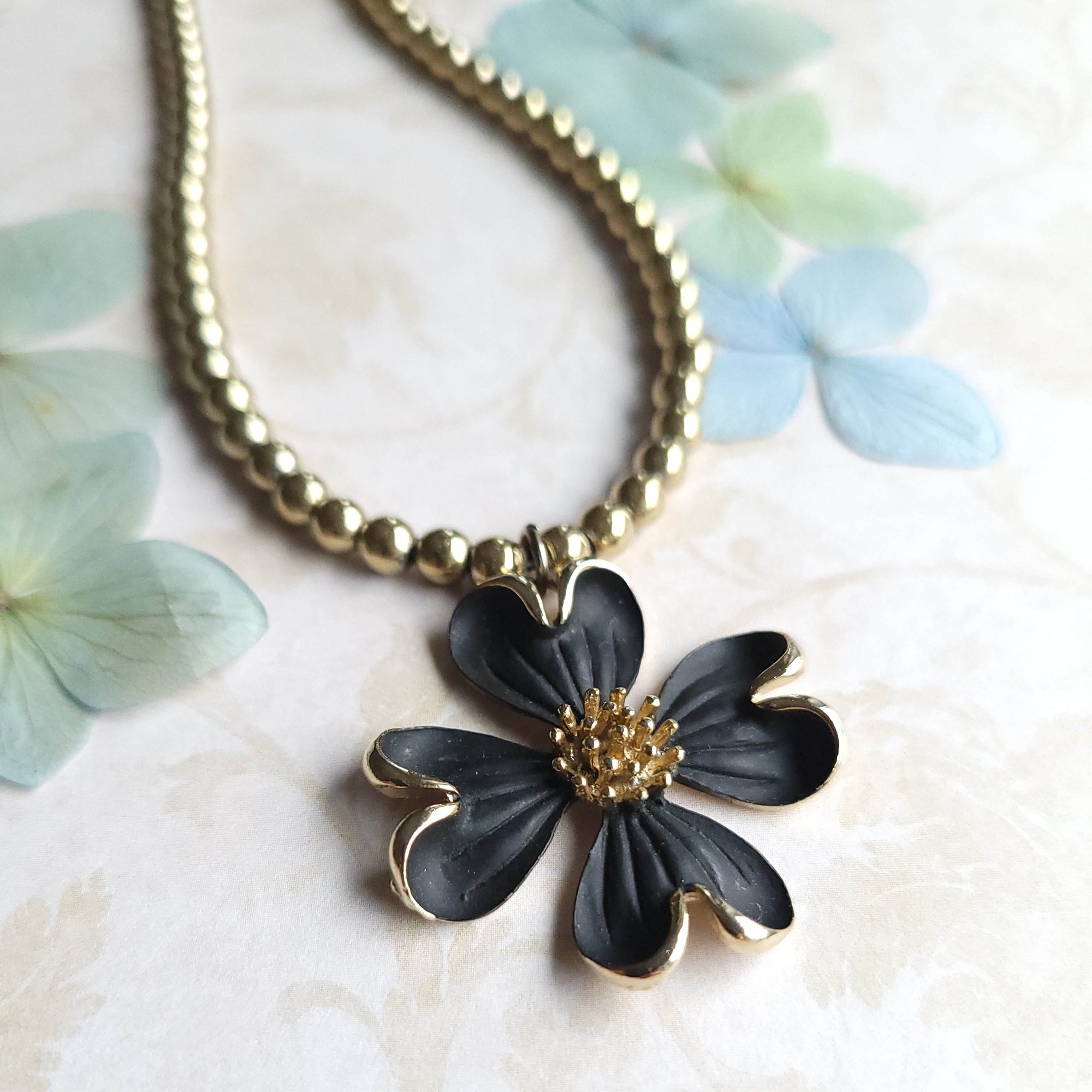Vintage Matte Black Dogwood Floral Pendant on Soft Gold Pyrite Beaded Necklace (One-of-a-Kind)