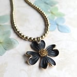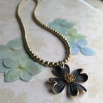 So. Very. Pretty. One-of-a-Kind necklace. An unusual vintage matte black and gold dogwood pendant hangs from a simple and sophisticated strand of small (4mm) gold pyrite beads. Pendant is beautifully detailed and in excellent condition. Sophisticated and sweet. Finished with a matte gold brass lobster clasp. Adjustable length from 17’ - 18”. Pendant measures 1-1/4” round.