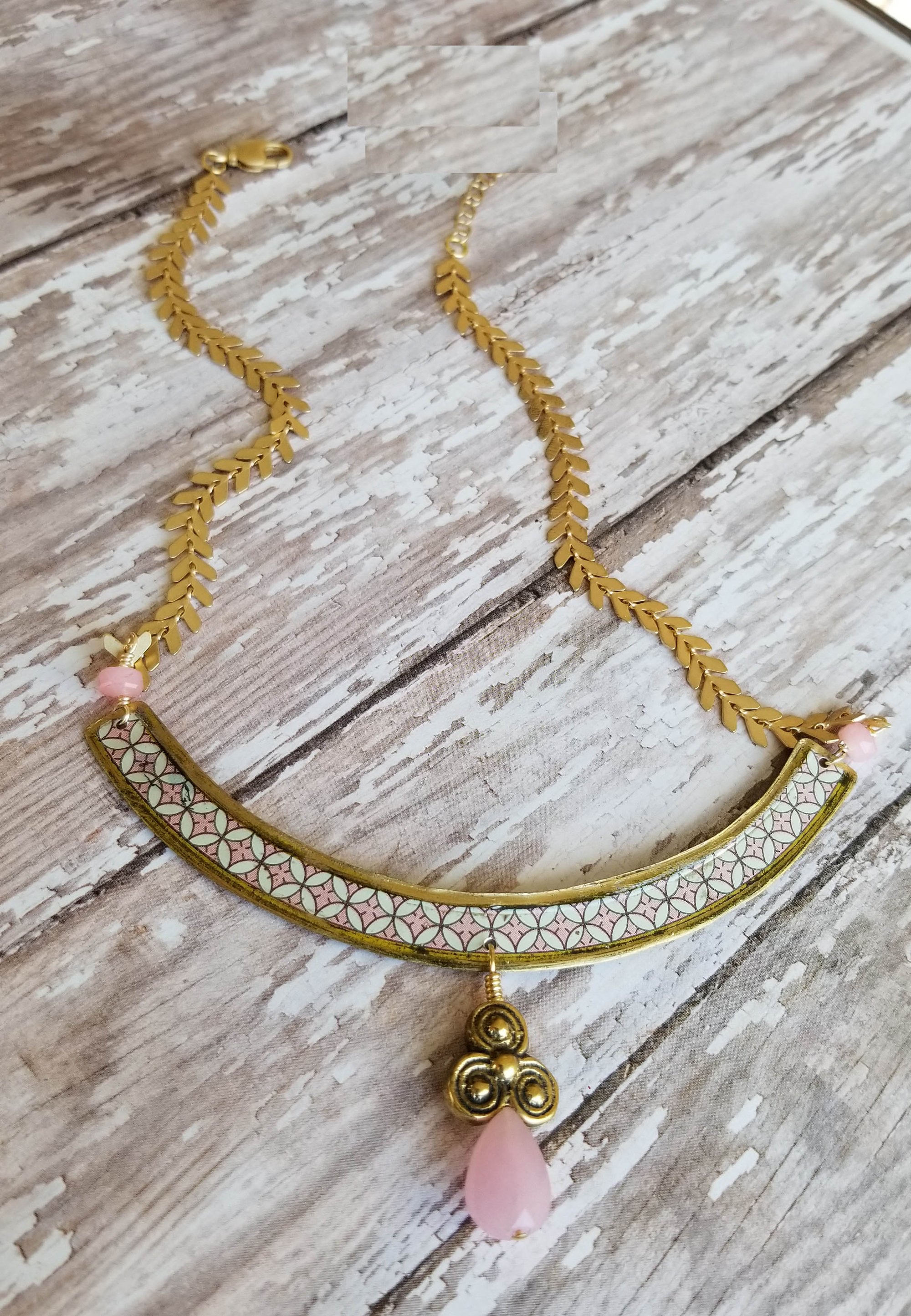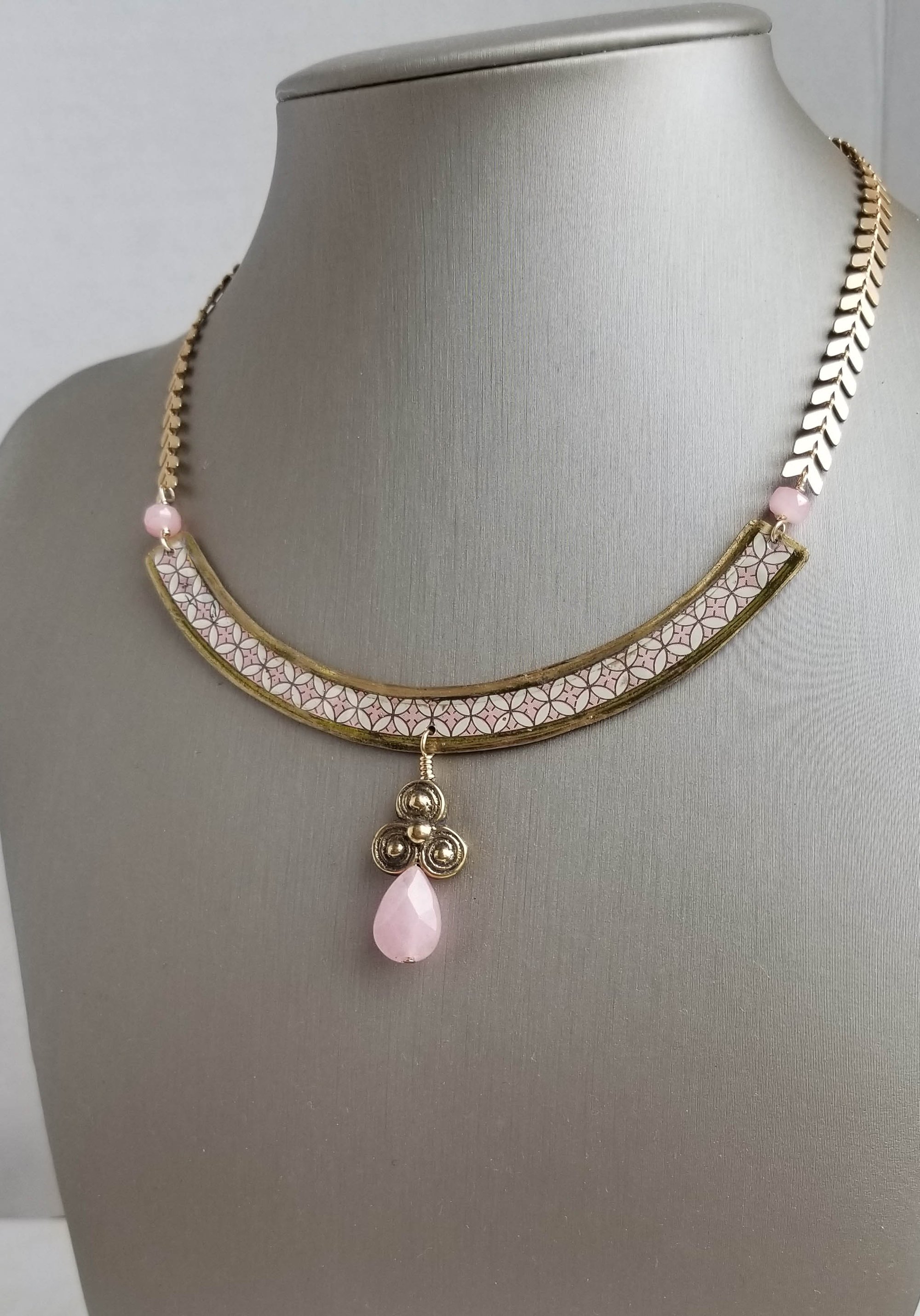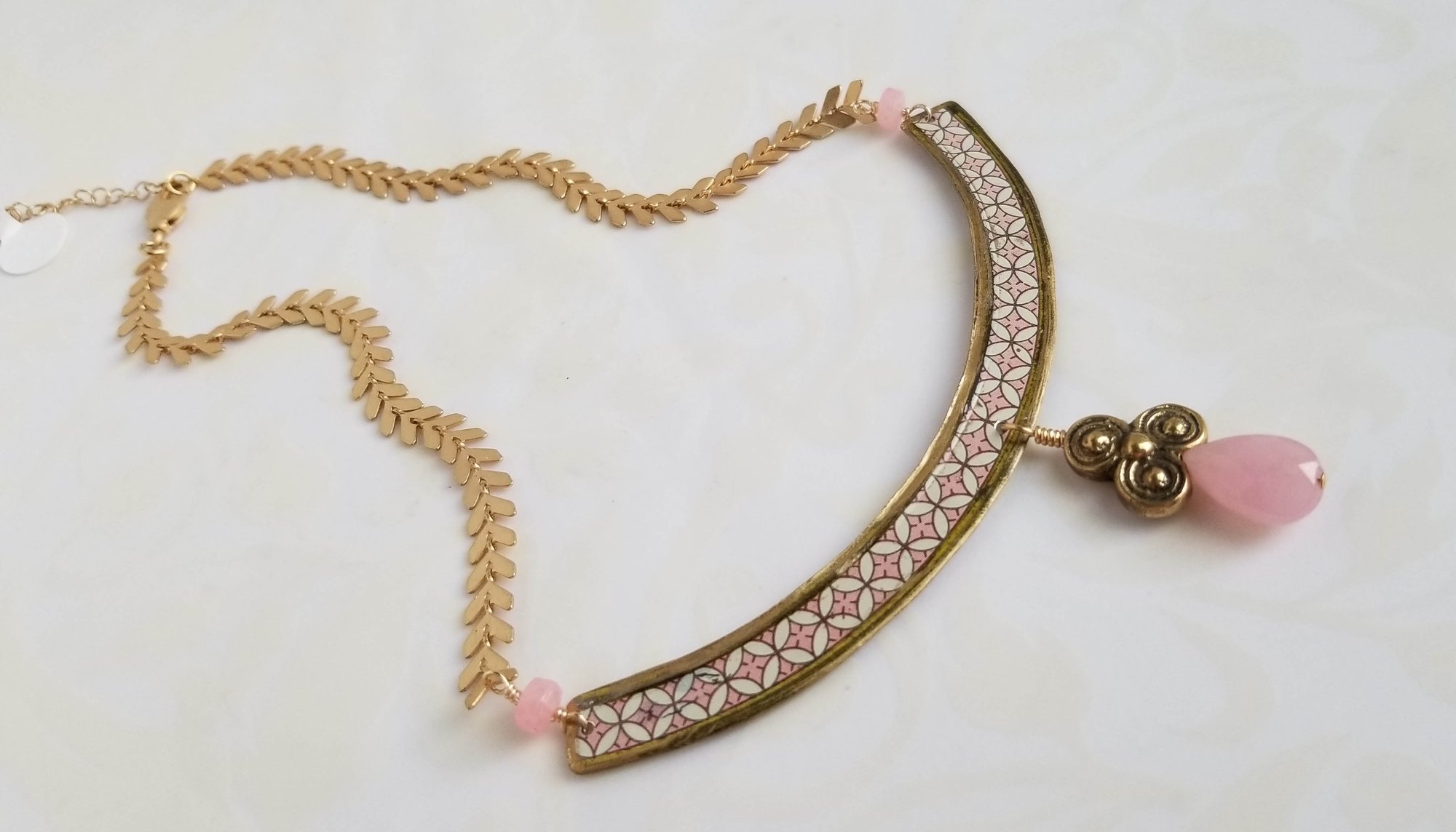 A pretty pink and white collar necklace hand cut from a vintage tea tin. A soft pink jade teardrop and brass pendant hangs from the center of the tin collar. Two tiny pink crystals attach to an elegant matte gold chevron chain (long-lasting electroplated gold over brass chain; naturally lead and nickel free). Finished with a matte gold lobster clasp.