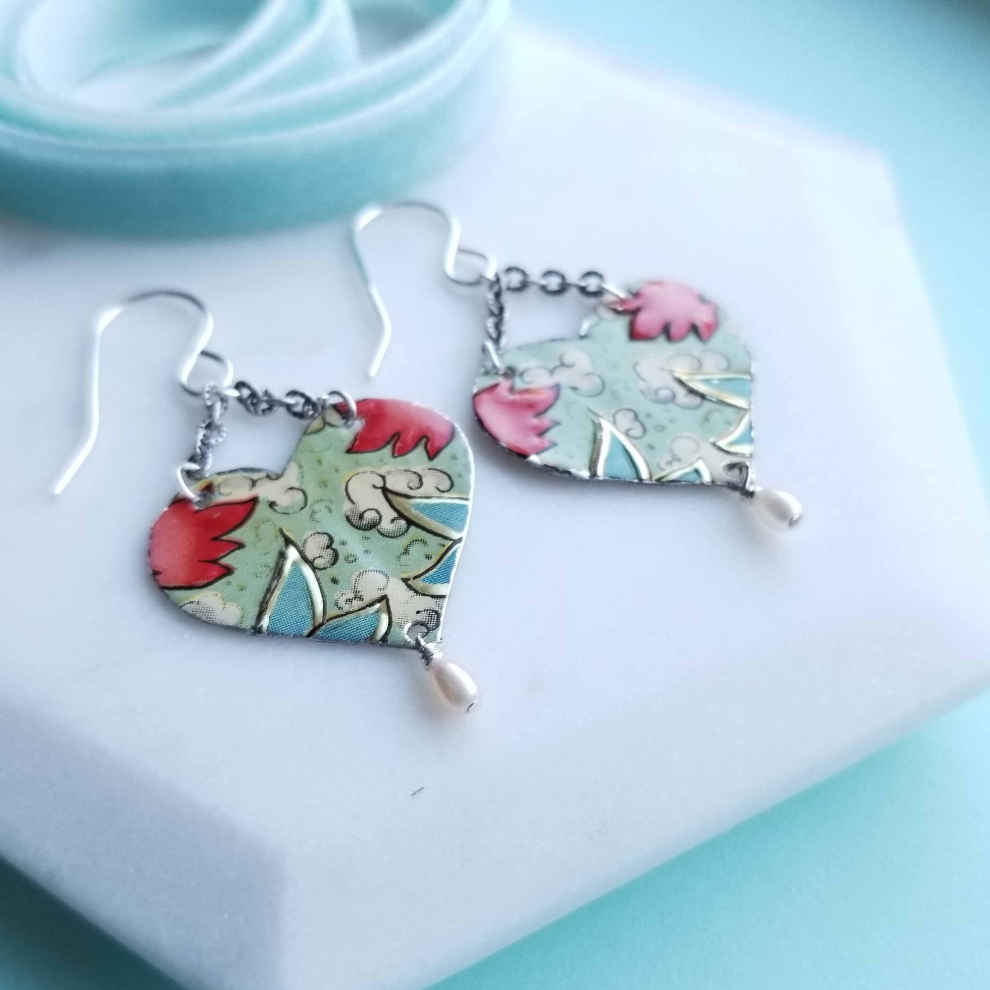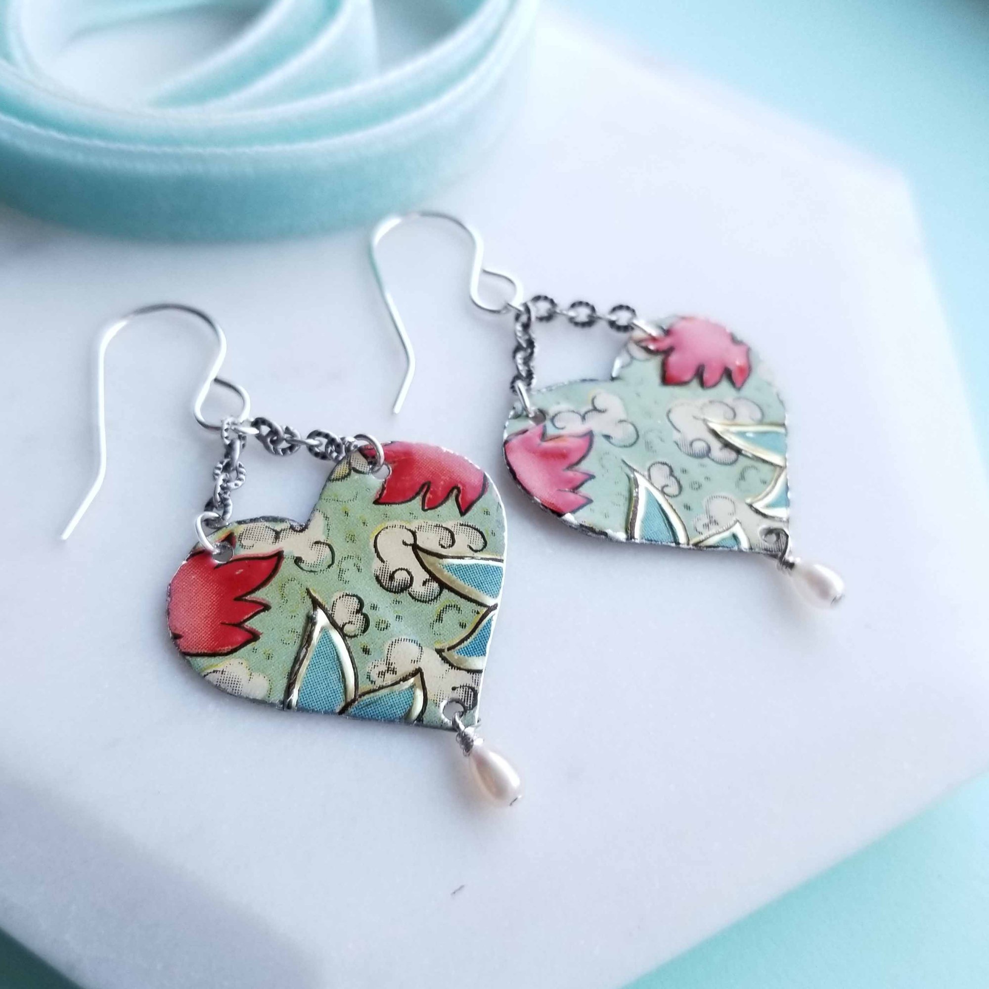 Pretty mint green + red hearts, hand-cut from a vintage biscuit tin with dangling tiny freshwater pearls. Hanging from d ear sterling silver ear wires. Very sweet. Length is 2” from the top of the ear wire to the bottom of the pearl.