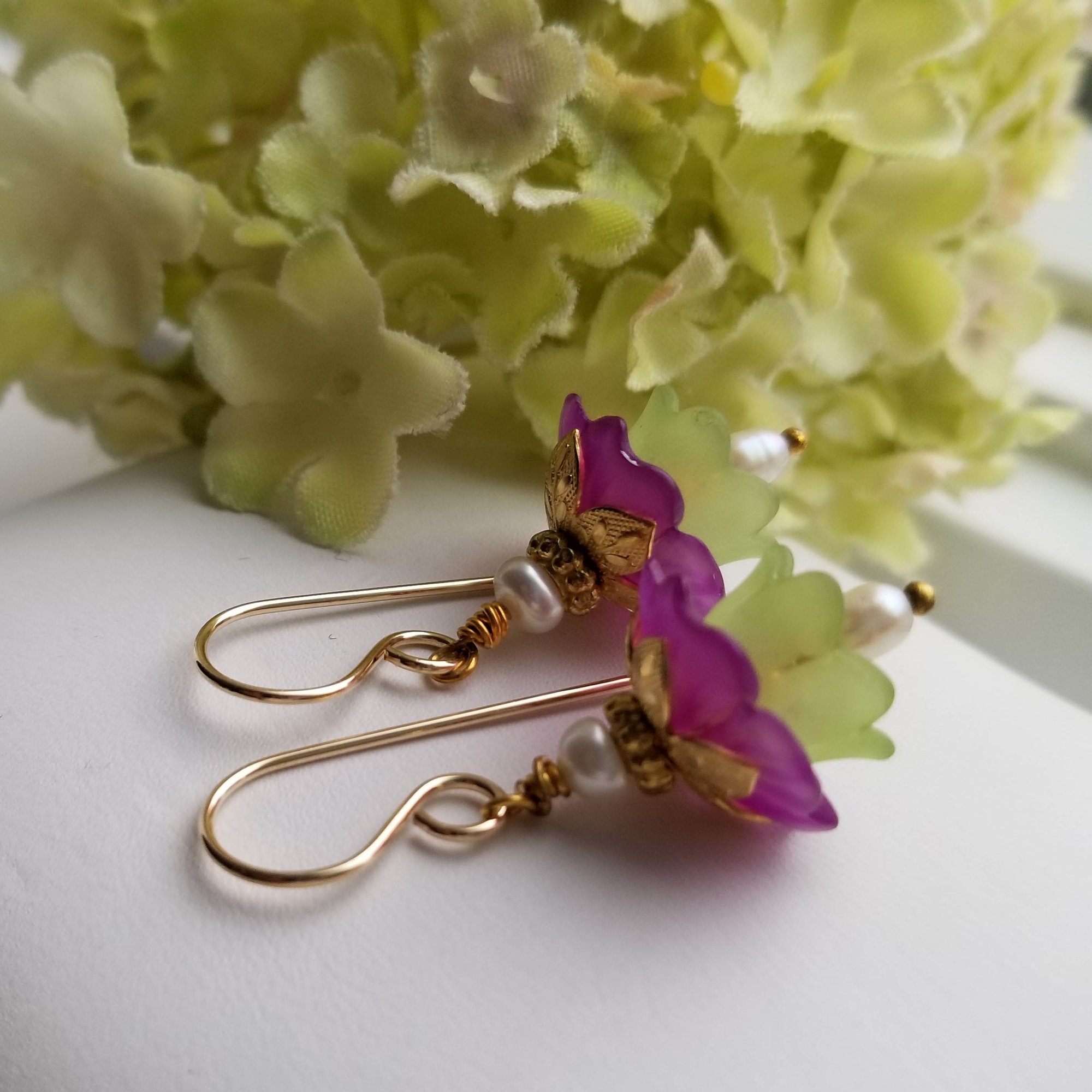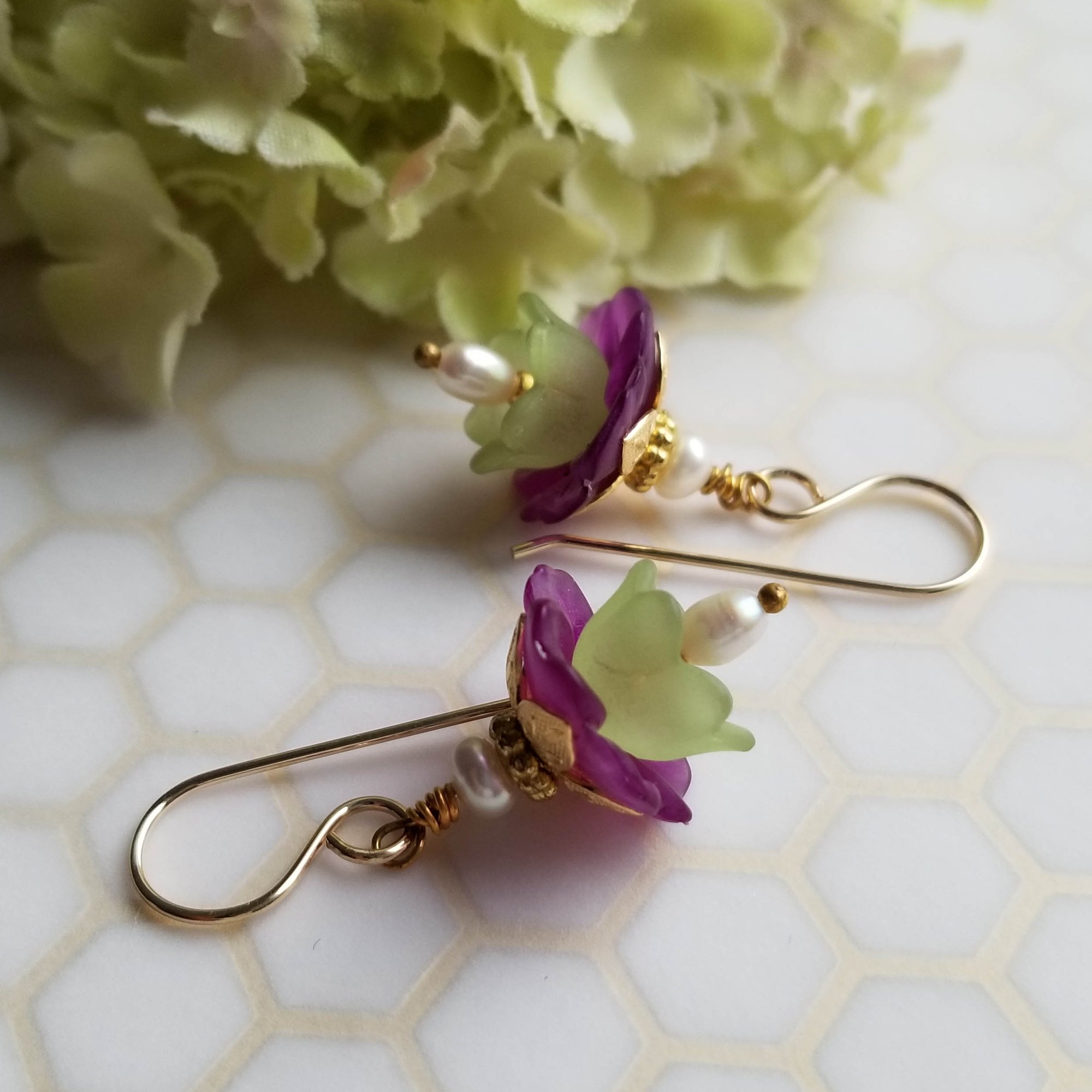 Romantic. Lovely. Sweet. Vintage lucite in violet and green shelter a tiny teardrop freshwater pearl inside. Topped with shiny brass caps and tiny freshwater pearl rondelles. Hanging from gold filled ear wires.