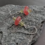 Yummy matte watermelon and soft citrus green sea glass beads make an interesting combination in these unique earrings. Sterling ear wires. These are a great casual earring. Length is 1.25” from the top of the ear wire to the bottom of the earring.