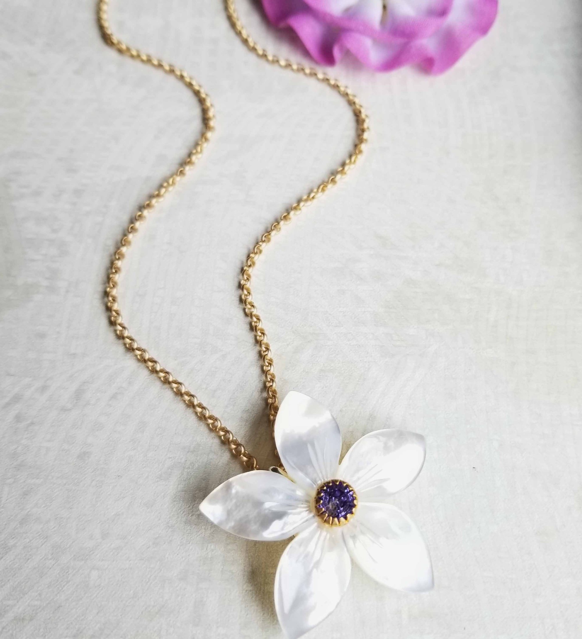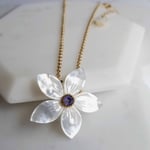 Lovely. Lovely. Lovely. A beautifully carved mother of pearl gardenia flower makes the prettiest focal for this sweet necklace. An tanzanite-colored Swarovski crystal in the center. Matte gold chain finished with a matte gold lobster clasp. Pendant measures 1-3/8". Necklace length is adjustable from 15" - 17".