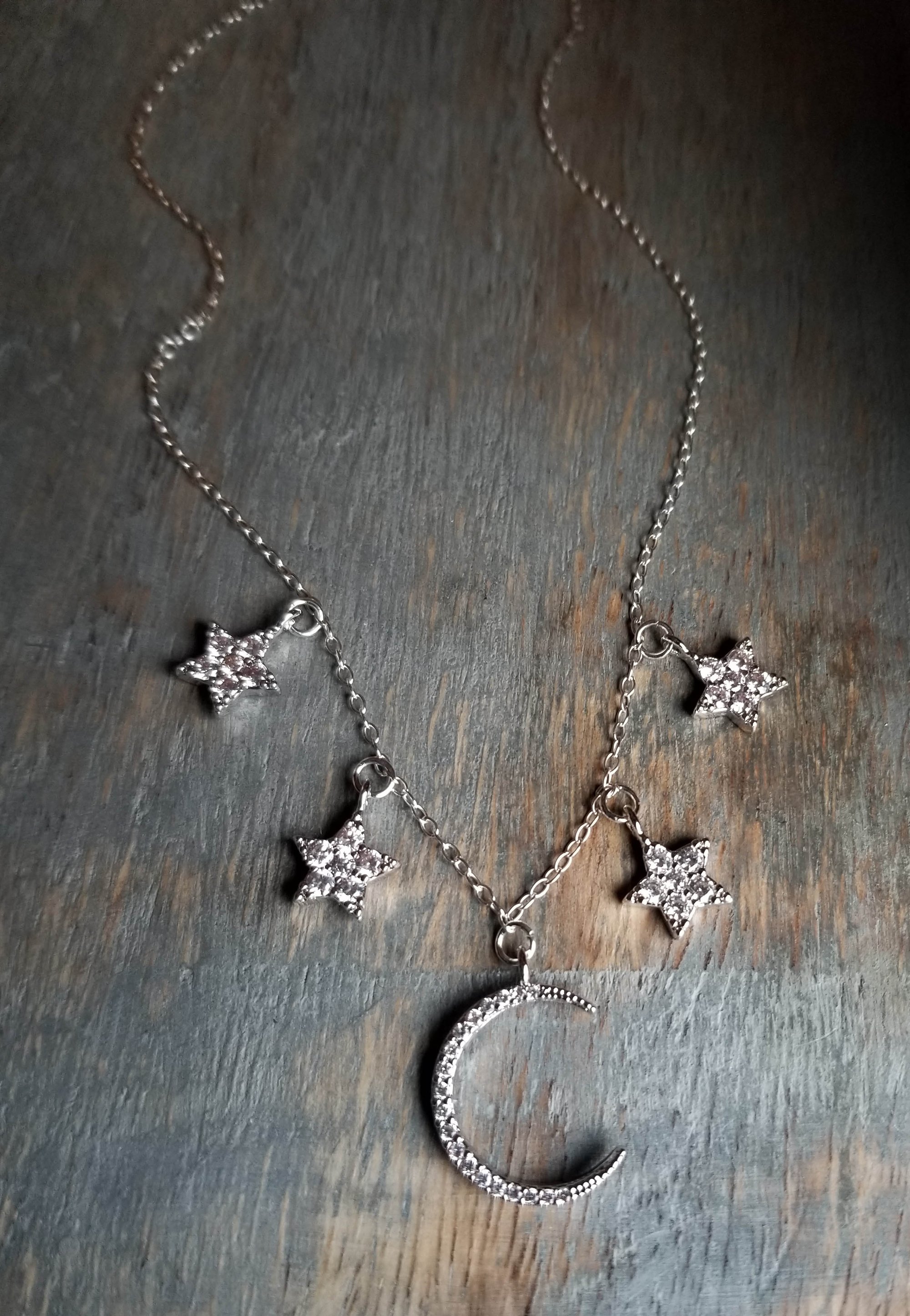 A galaxy of beautiful cubic zirconia studded stars and a sliver of a moon make make a stunning display. A versatile piece - classic beauty with a touch of bohemian. Sterling silver chain. Finished with a silver lobster clasp. Length is adjustable from 16" - 18-1/2".